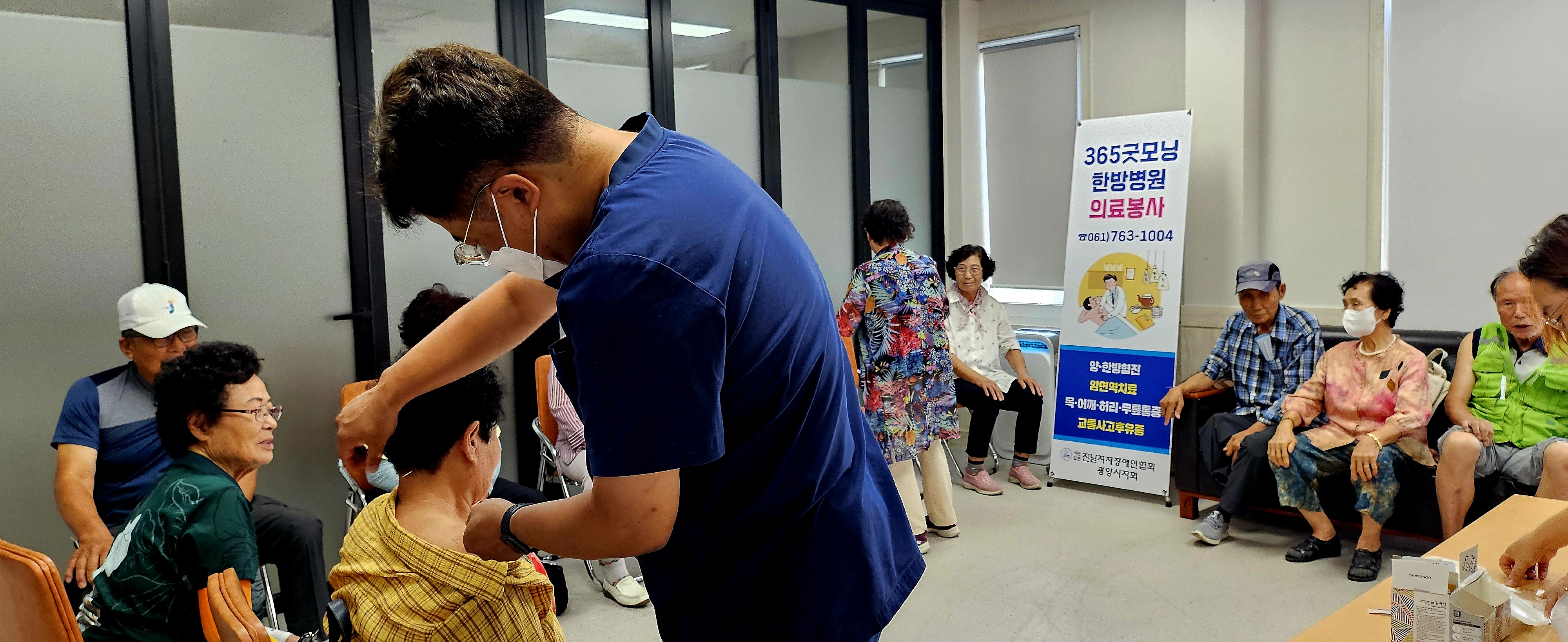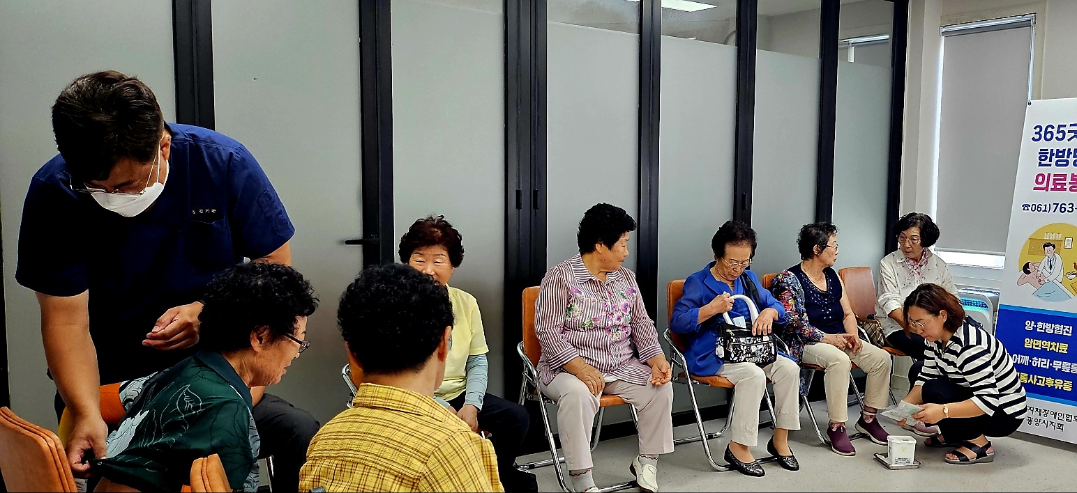 간밤에 시원하게 내린 비로 기승을 부리던 무더위가 한풀 꺽이고, 제법 선선한 바람이 불어오는 8월 28일(수) 사)전남지체장애인협회 광양시지회는 365굿모닝 한방병원과 함께 지역 어르신들에게 의료봉사활동을 펼쳤다.