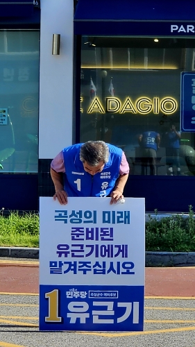 더불어민주당 경선을 앞두고 유근기 전 군수가 군청 앞 사거리에서 출근길 공무원들에게 낮은 자세로 인사하며 지...