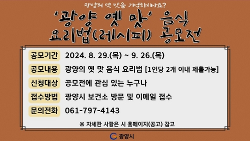 광양시(보건소)는 잊힌 광양의 옛 맛 음식 발굴·복원을 위한 공모전을 개최해 오는 9월 26일까지 신청서를 ...