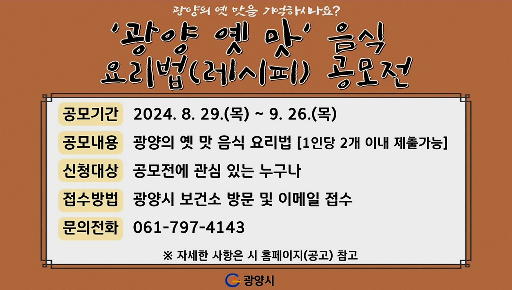 광양시(보건소)는 잊힌 광양의 옛 맛 음식 발굴·복원을 위한 공모전을 개최해 오는 9월 26일까지 신청서를 받는다고 밝혔다.
