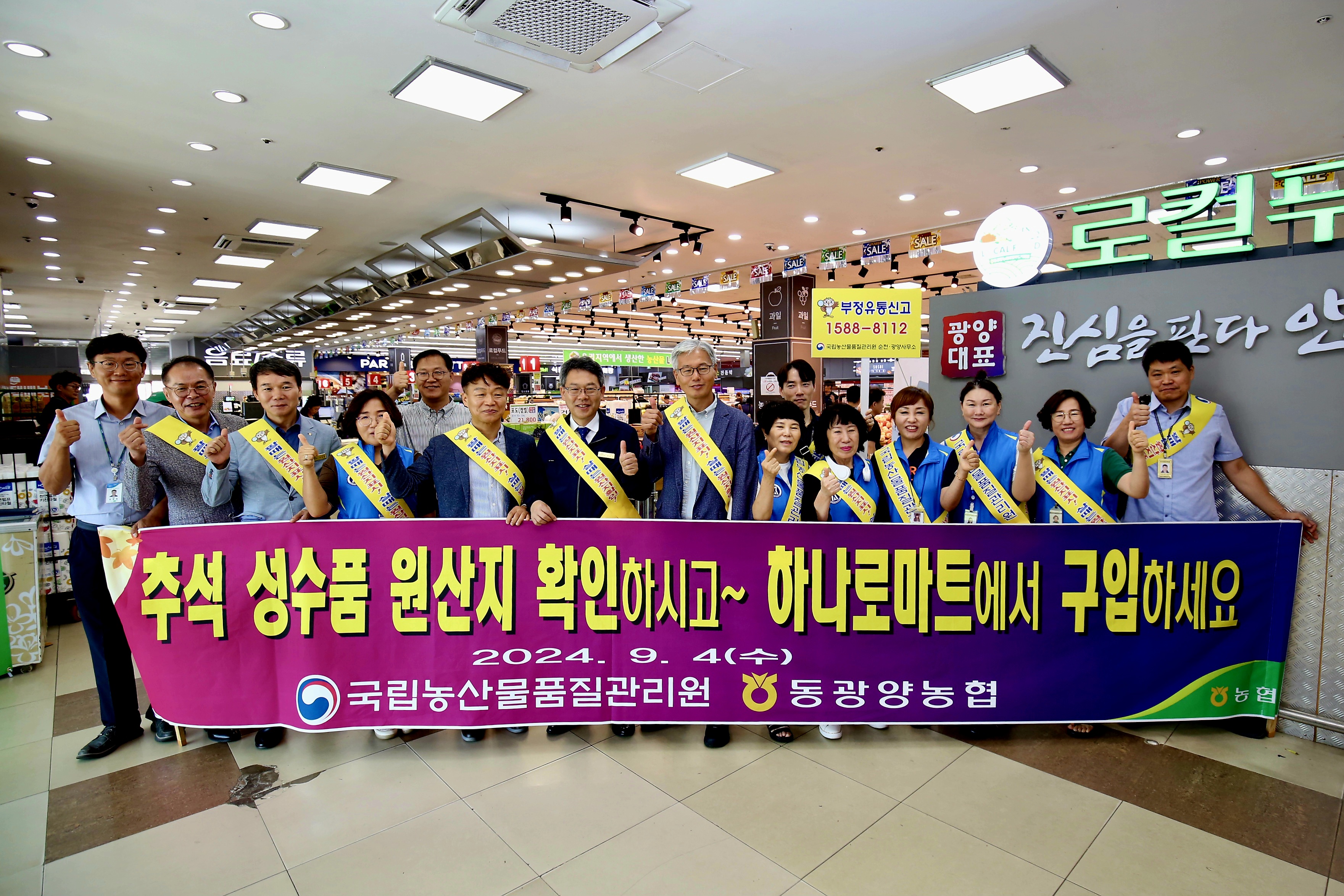 동광양농협(조합장 이돈성)이 국립농산물품질관리원 전남지원(지원장 방도혁)과 추석을 앞두고 지난 4일 동광양농협하나로마트와 중마시장에서 원산지 표시 점검 및 홍보 캠페인을 펼쳤다.