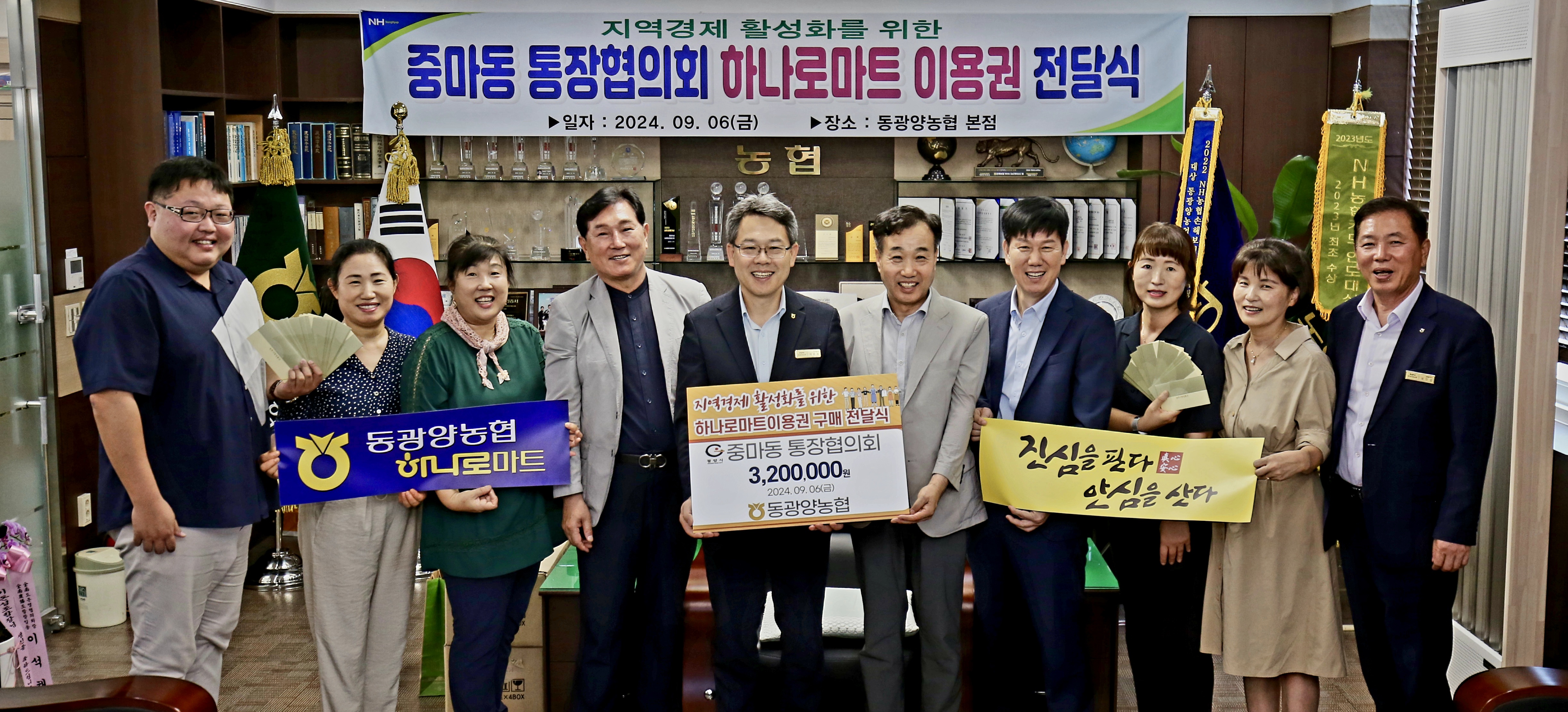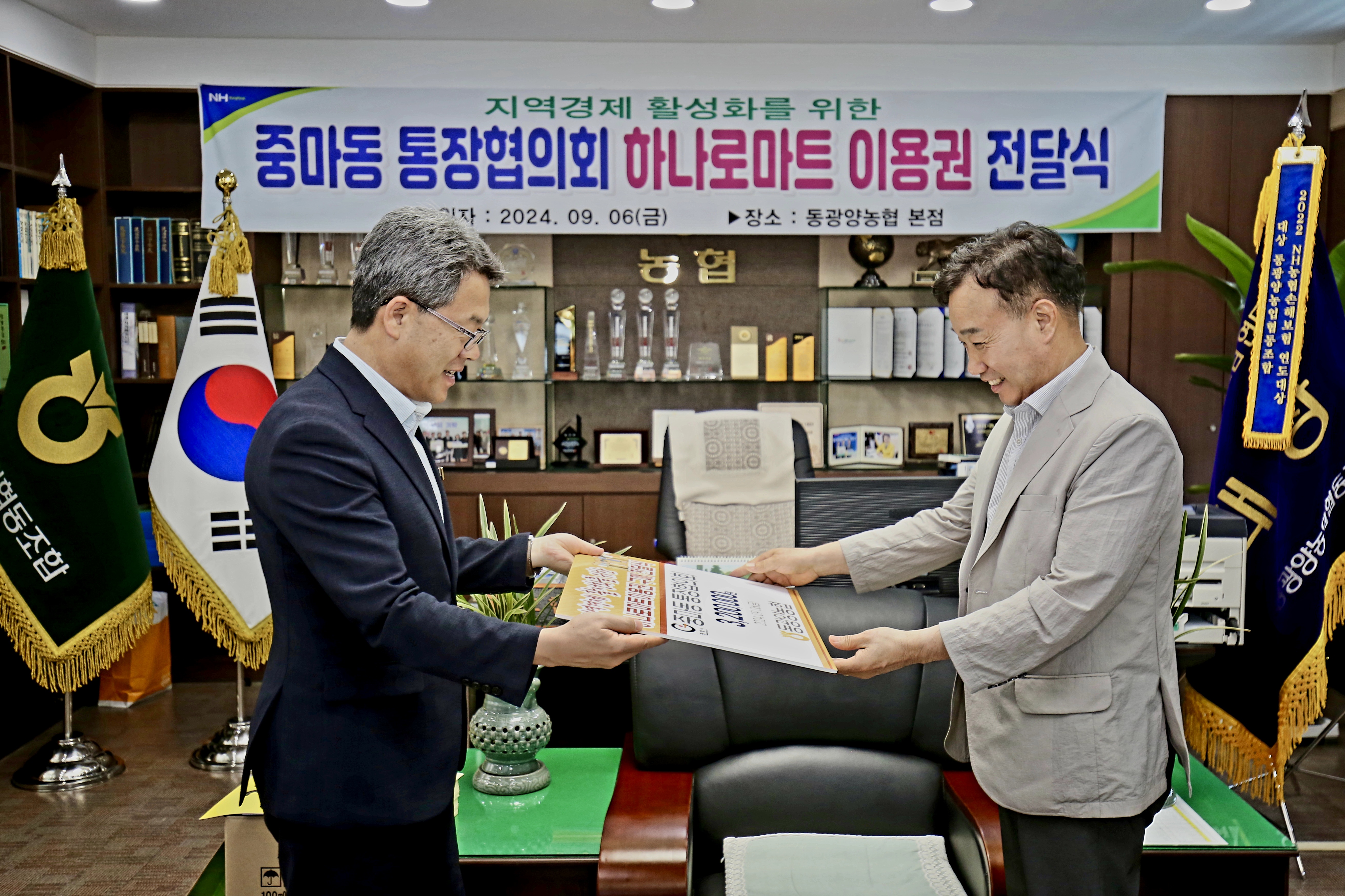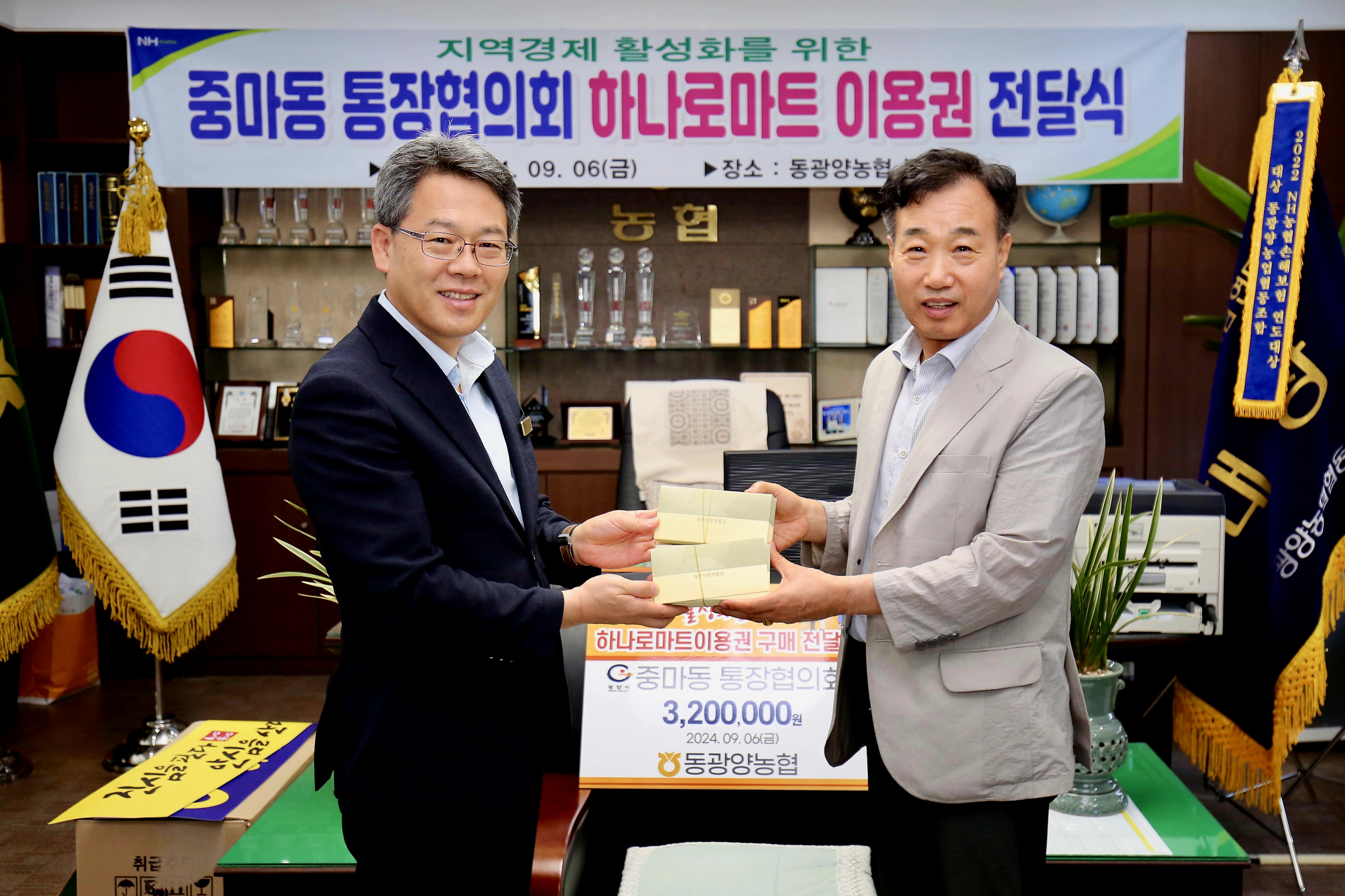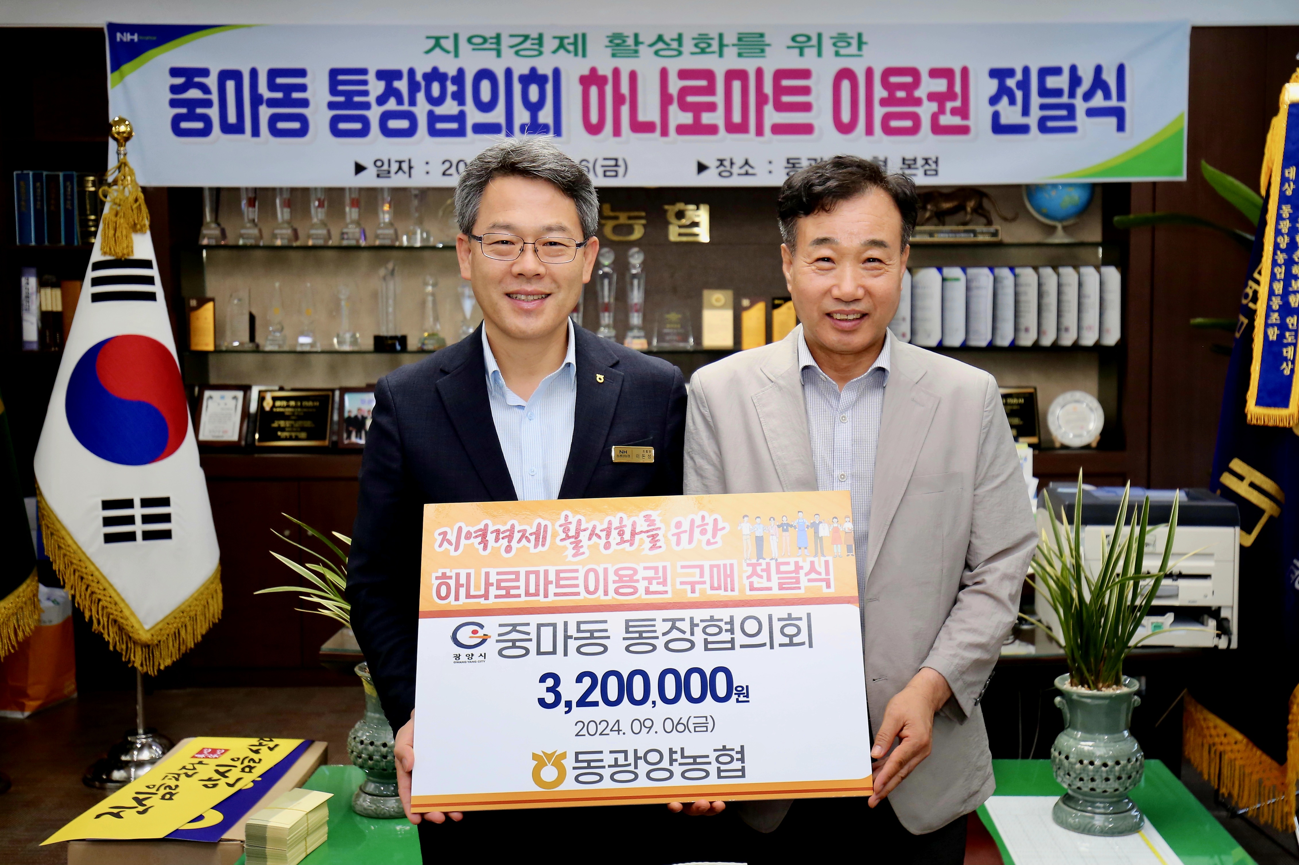 이를 지켜본 광양시 중마동통장협의회는 지역농축수산물 소비에 적극 동참하기 위해 동광양농협하나로마트 이용권 320만원을 구입하였고, 동광양농협은 감사의 마음을 담아 전달식을 마련했다.