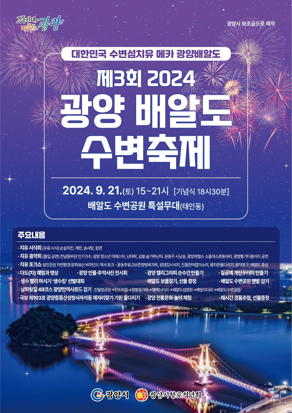 2024 제3회 광양 배알도 수변축제가 오는 9월 21일(토) 오후 3시부터 9시까지 광양시 태인동 배알도 수변공원 일원에서 개최된다.