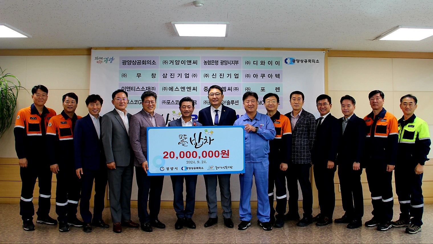 기탁식에는 광양시 정인화시장과 광양상공회의소 우광일회장을 비롯하여 성금모금에 참여한 15개 회원사[(주)거양이앤씨, 농협은행 광양시지부, ㈜디와이이, ㈜무창, 삼진기업(주), ㈜신진기업, ㈜아쿠아텍, 이앤티스소재(주)광양지점, ㈜에스엔엔씨, ㈜중앙이엠씨, ㈜포렌, (주)포스코GYR테크, (주)포스코GYS테크, (주)포스코GY솔루션, (주)포스코mc머티리얼즈 대표자들이 함께 참여한 가운데 진행되었다.