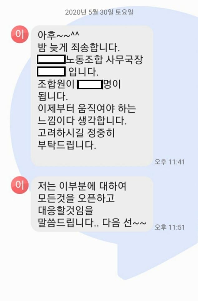 모 의원은 밤 늦은 시간에 모 노동조합 사무국장에게서 문자를 받았다 한다.