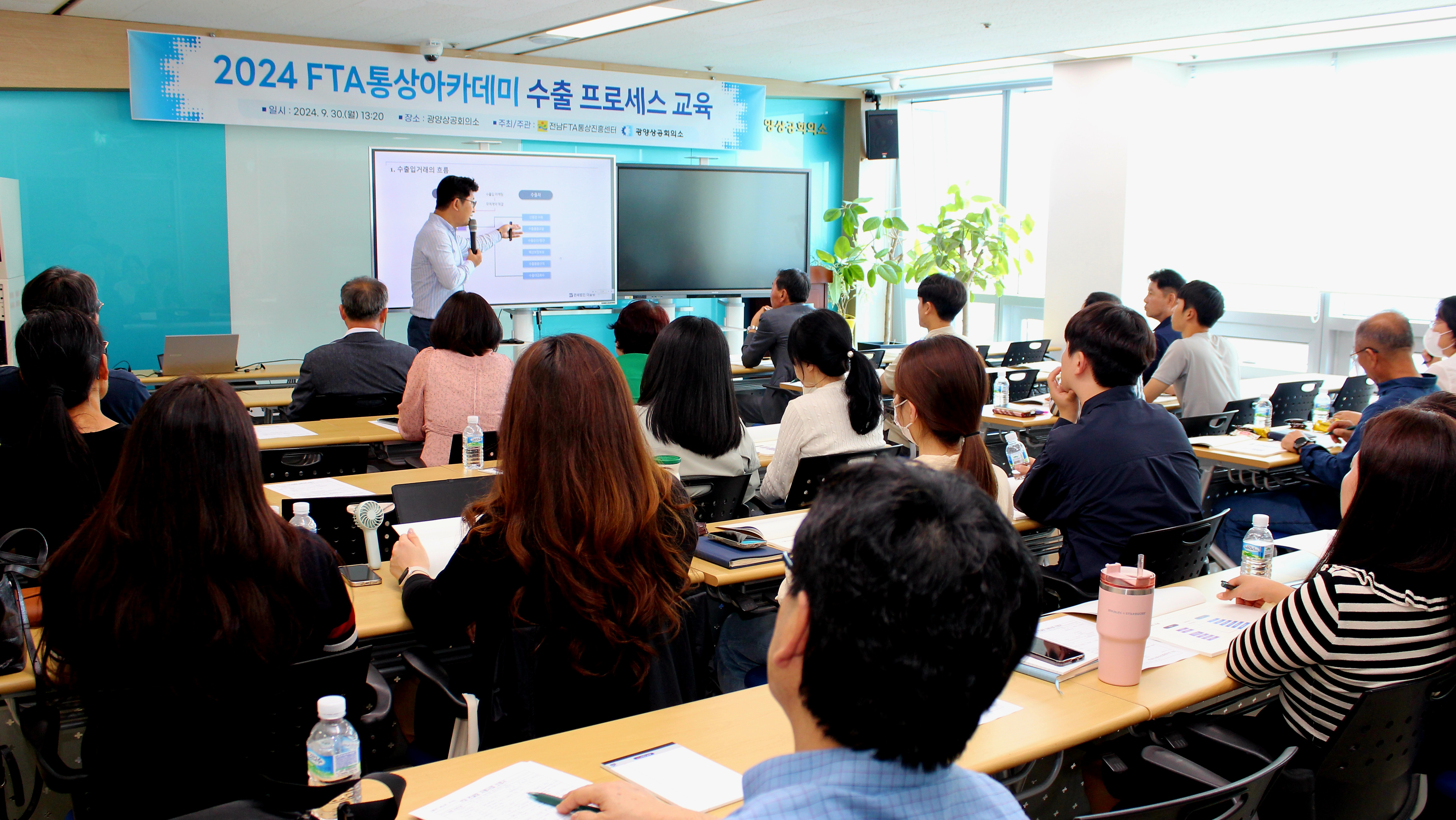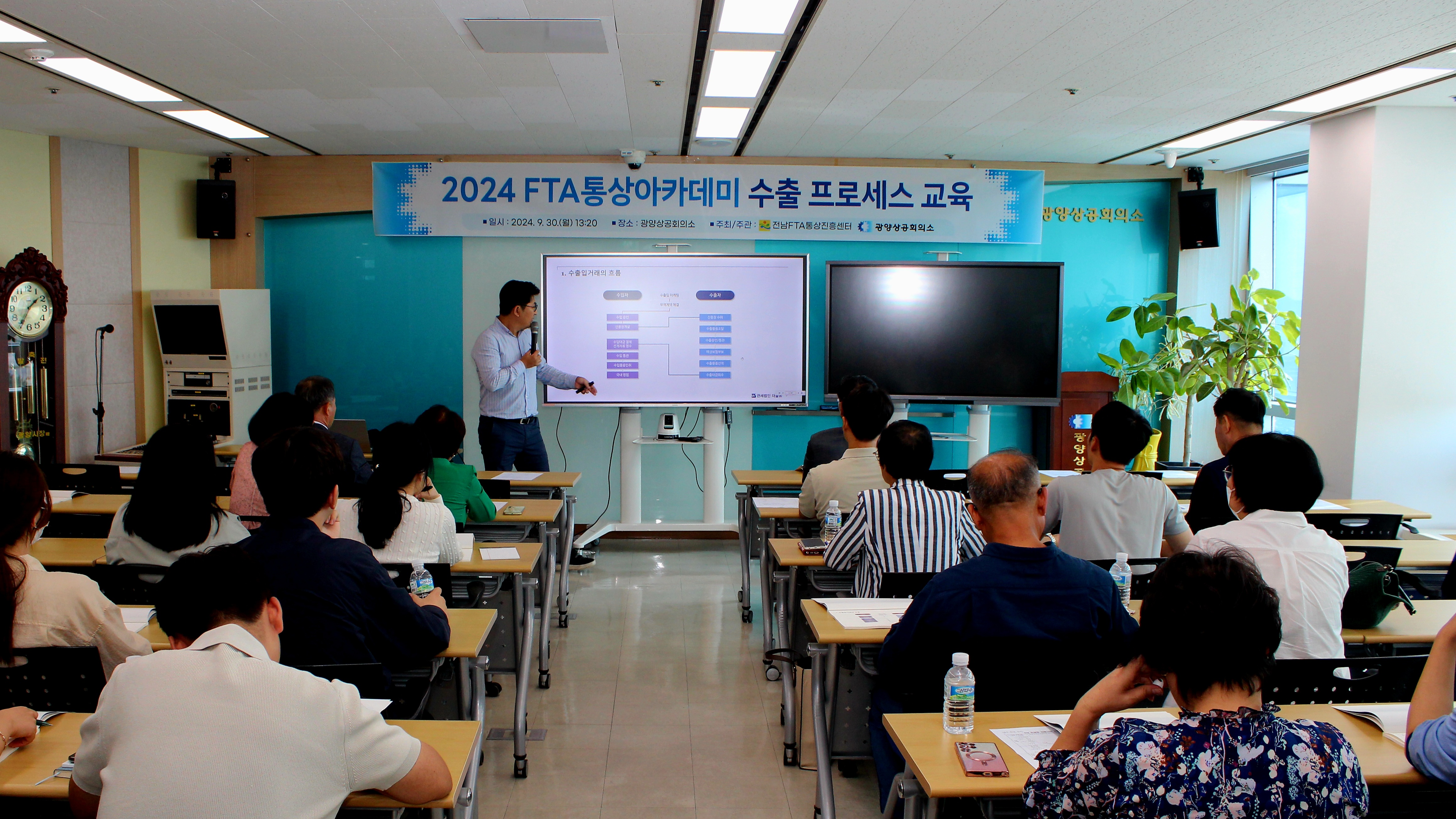 광양상공회의소(회장 우광일)는 9월 30일(월) 오후 13시 20분부터 광양상공회의소 교육장에서 전남중소기업일자리경제진흥원 FTA통상진흥센터와 공동으로 관내 수출입 업체 담당자 30여 명이 참석한 가운데「2024 FTA통상아카데미 수출 프로세스 교육」을 개최하였다.