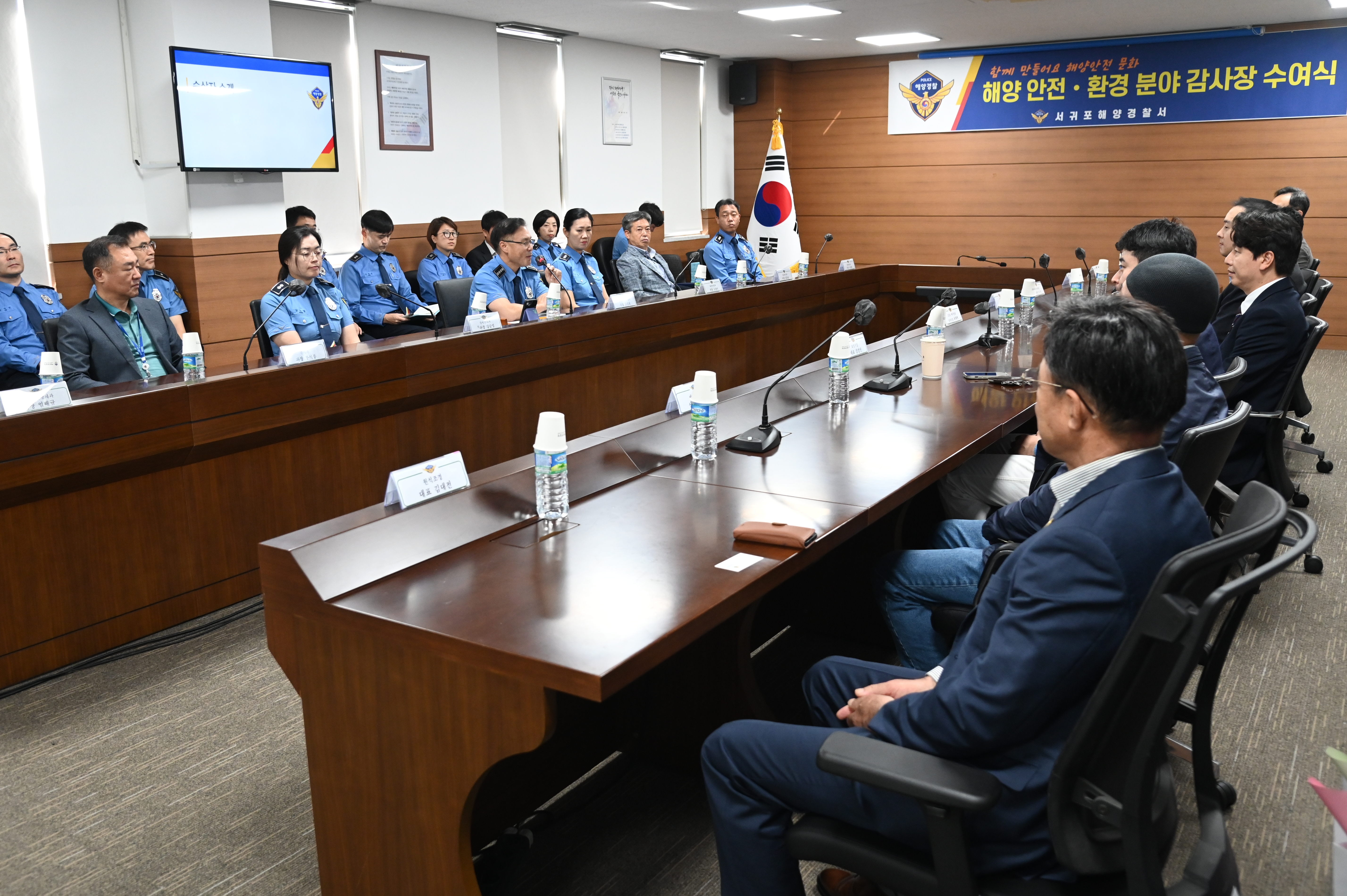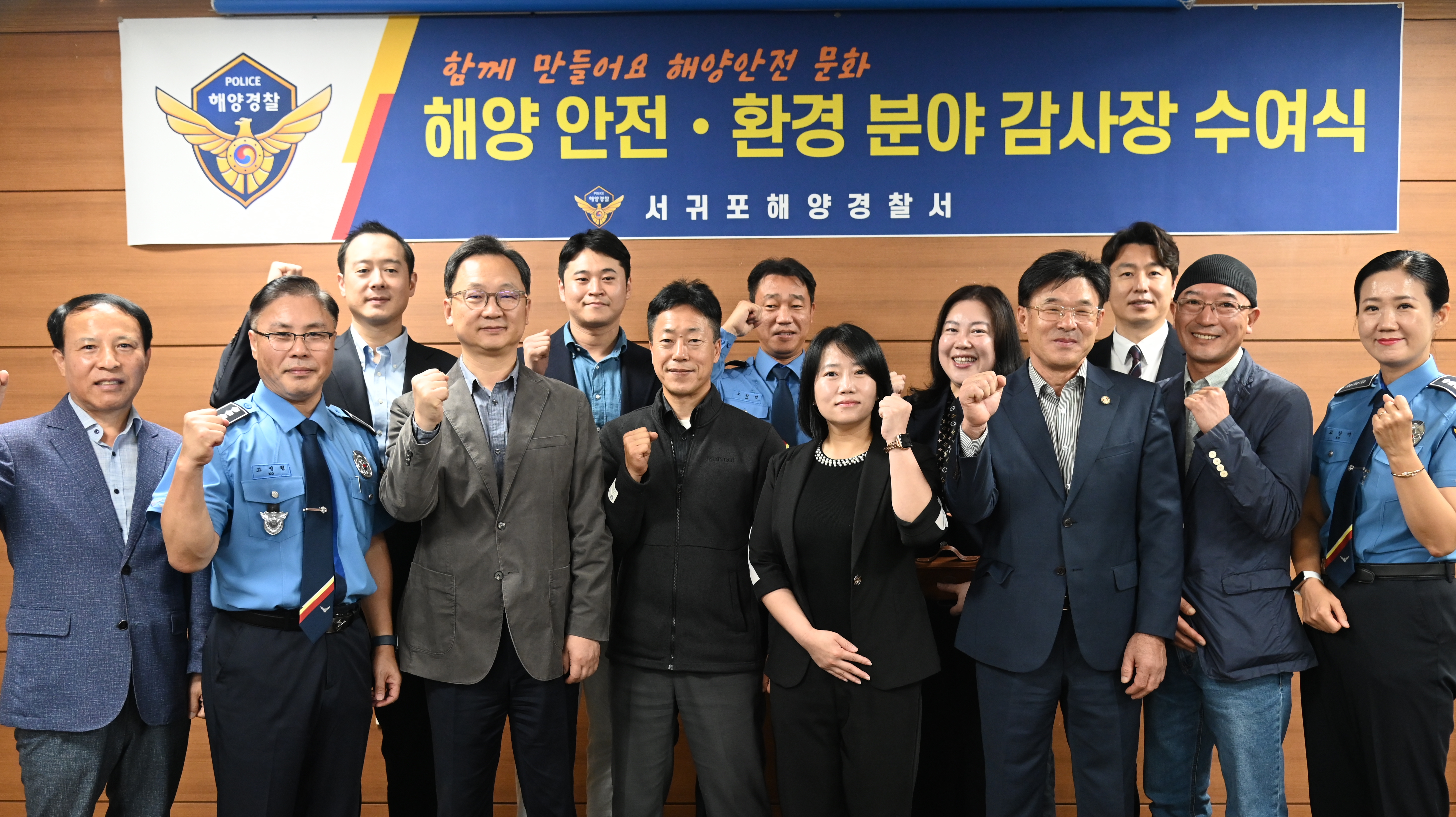 서귀포해양경찰서(서장 고성림)는 오늘(16일) 그 간 ▲여름철 해양안전 정보 제공·홍보 ▲국제연안정화의 날 기념 수중·연안 정화활동 ▲물놀이 안전교실 등 서귀포해경에 적극적인 협조를 해주신 공로자들에게 감사의 마음을 전하기 위해 감사장을 수여했다.