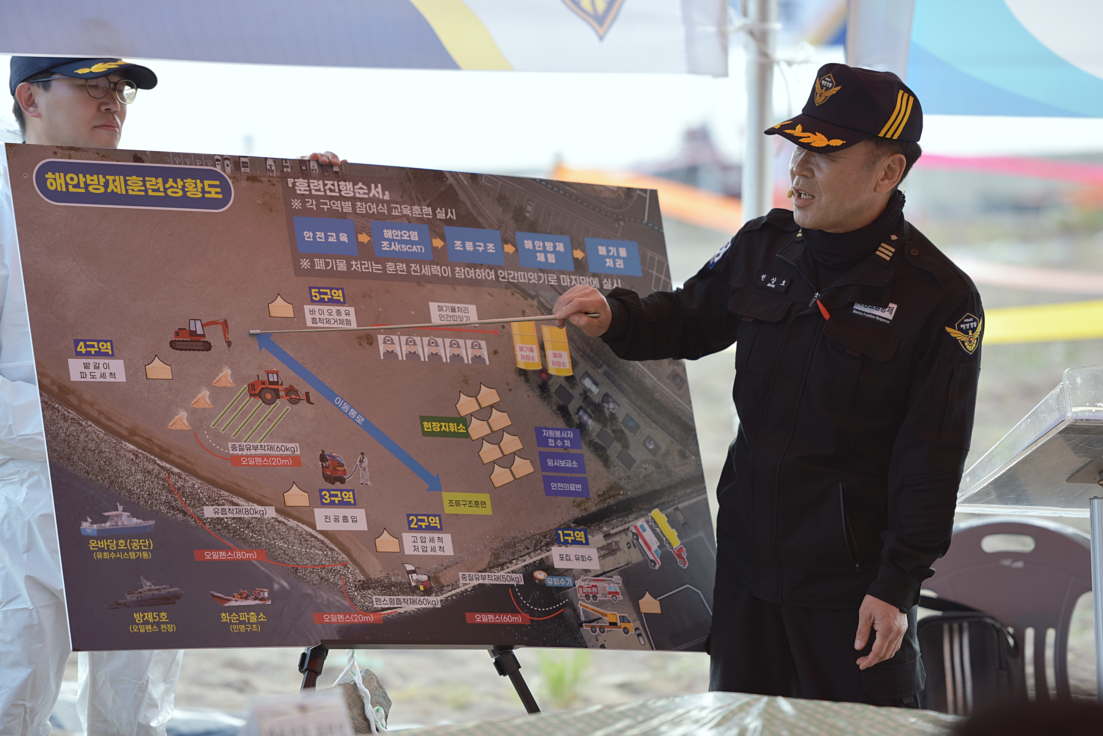 훈련은 입항 중인 화물선과 작업 중이던 유조선이 충돌하면서 유조선 화물탱크에 파손이 생겨 기름(바이오중유)*이 해상에 유출되어 화순항 내, 금모래해변에 대량 부착한 상황을 가정하여 진행했다.