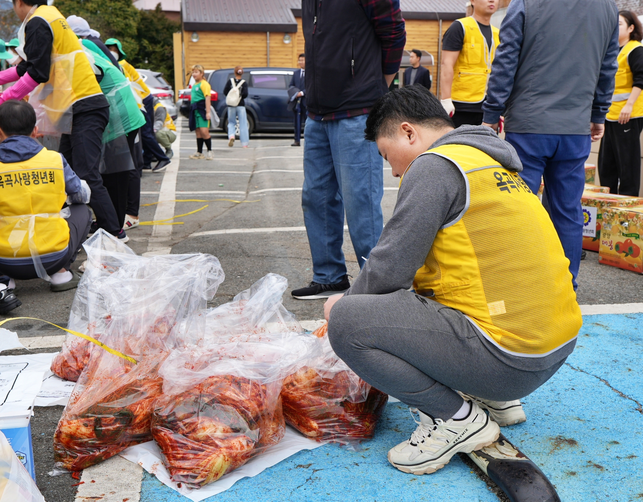 옥곡면이장단과 옥곡사랑청년회, 새마을 부녀회는 27일 오전 옥곡면사무소 앞마당에서 80여명이 모여 사랑의 김장나눔봉사를 진행했다.