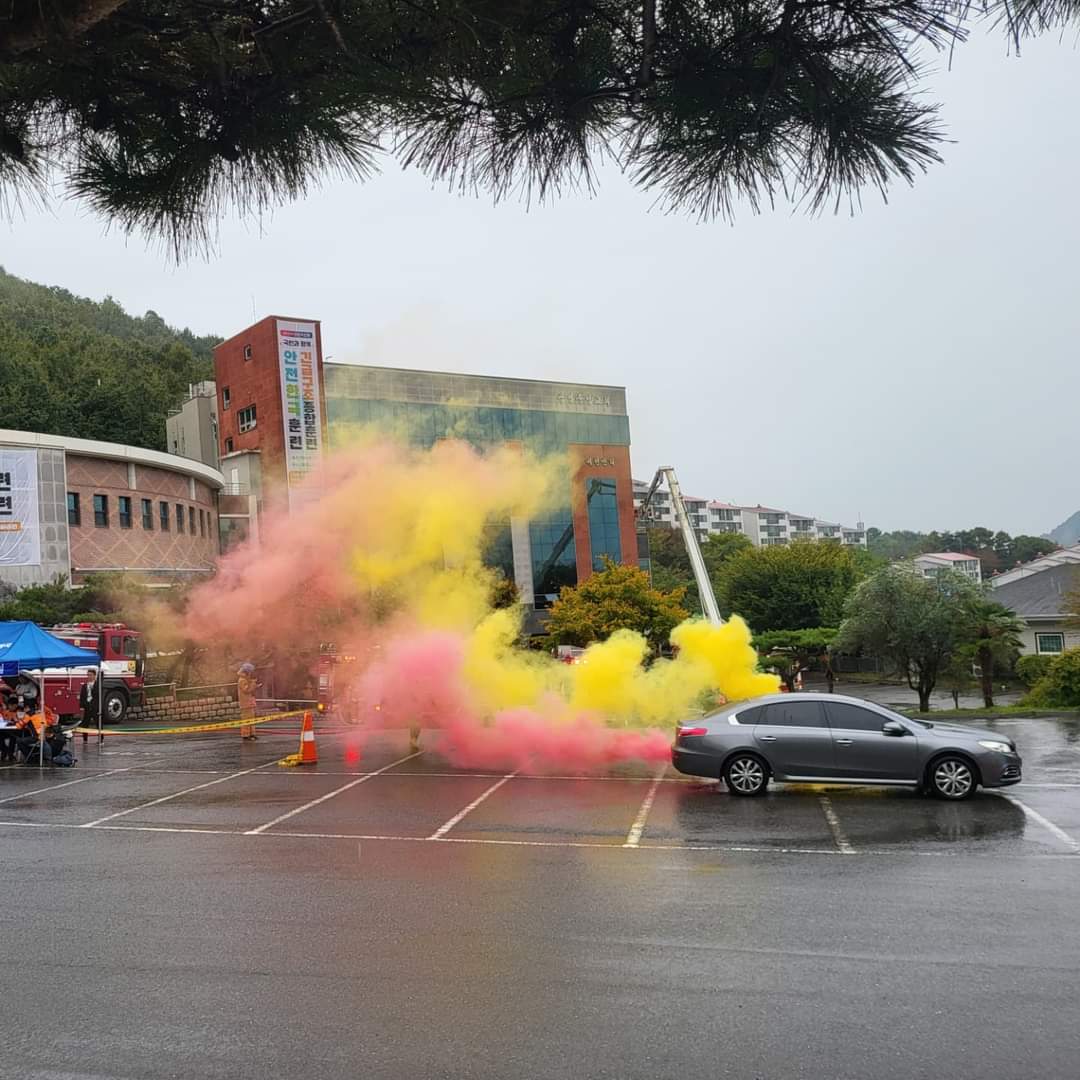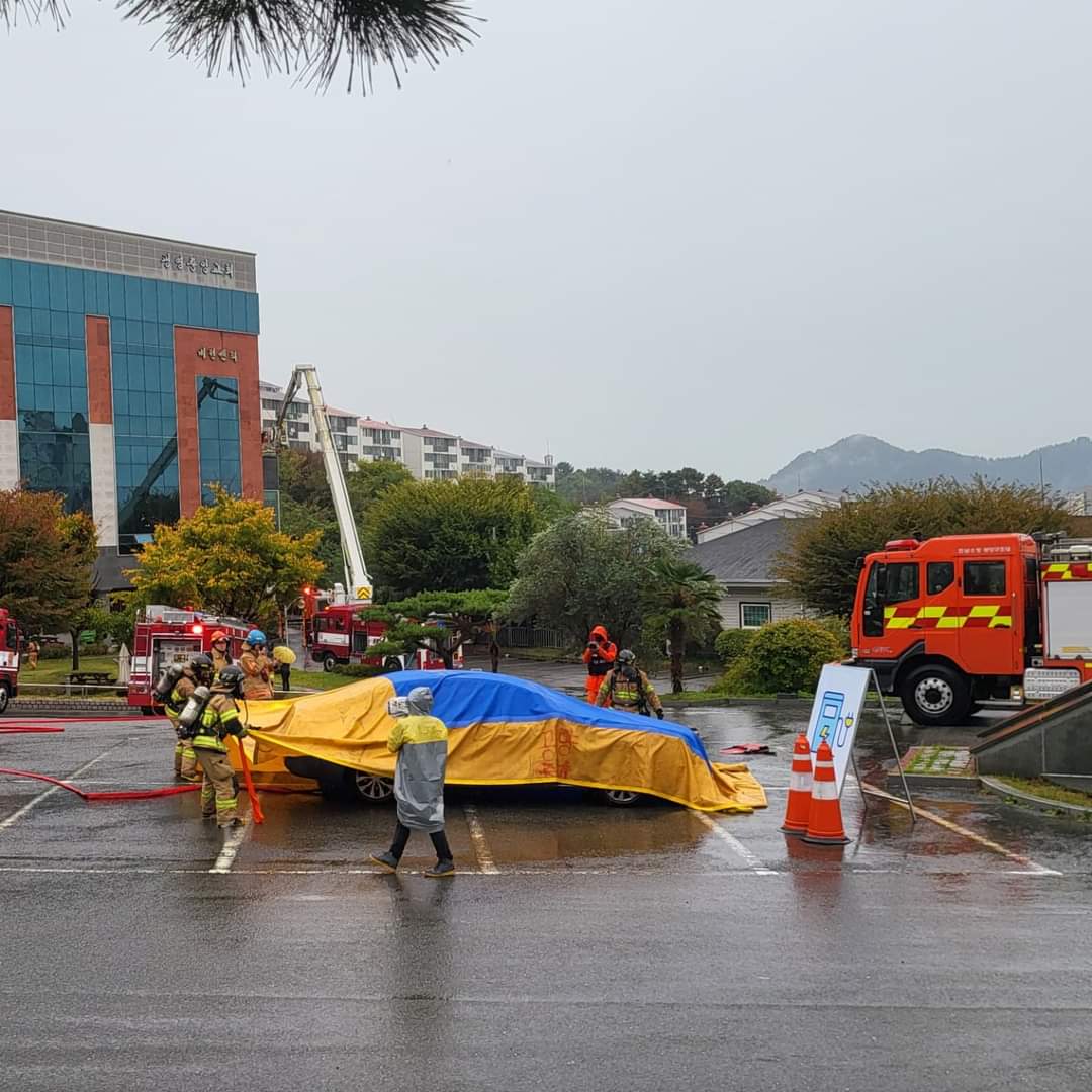 △특히 전기차 화재를 가상하여 전기차하부에 하부진압 관창을 사용하여 물을 방수하고 차량에는 방수포를 덮어 전기차 화재를 진압하는 과정도 함께 병행하였다.