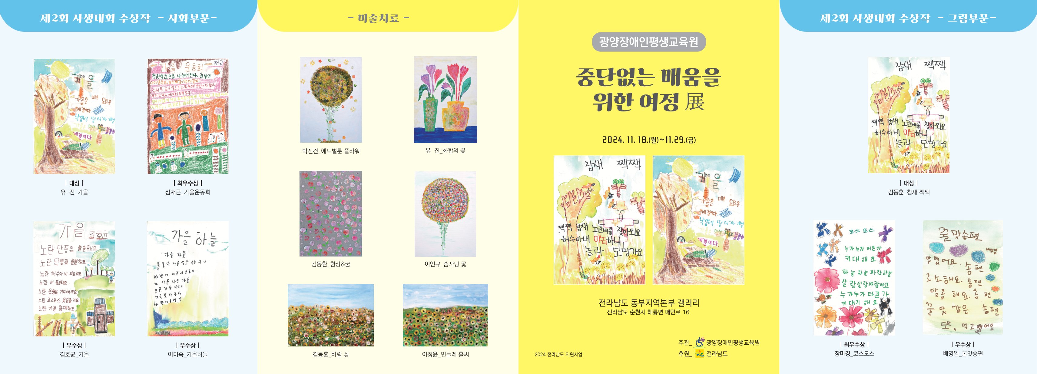광양장애인평생교육원 배수미 원장은 “이번 전시회는 ‘가을’을 주제로 한 사생대회 작품들과 학습자들이 정성과 열정을 담아 완성한 결실”이라며 “지역 주민들과 함께 의미 있는 시간을 나눌 수 있어 매우 뜻깊다. 많은 분들이 전시장을 찾아 학습자들의 노력과 성과를 응원해 주시길 바란다.”고 전했다.