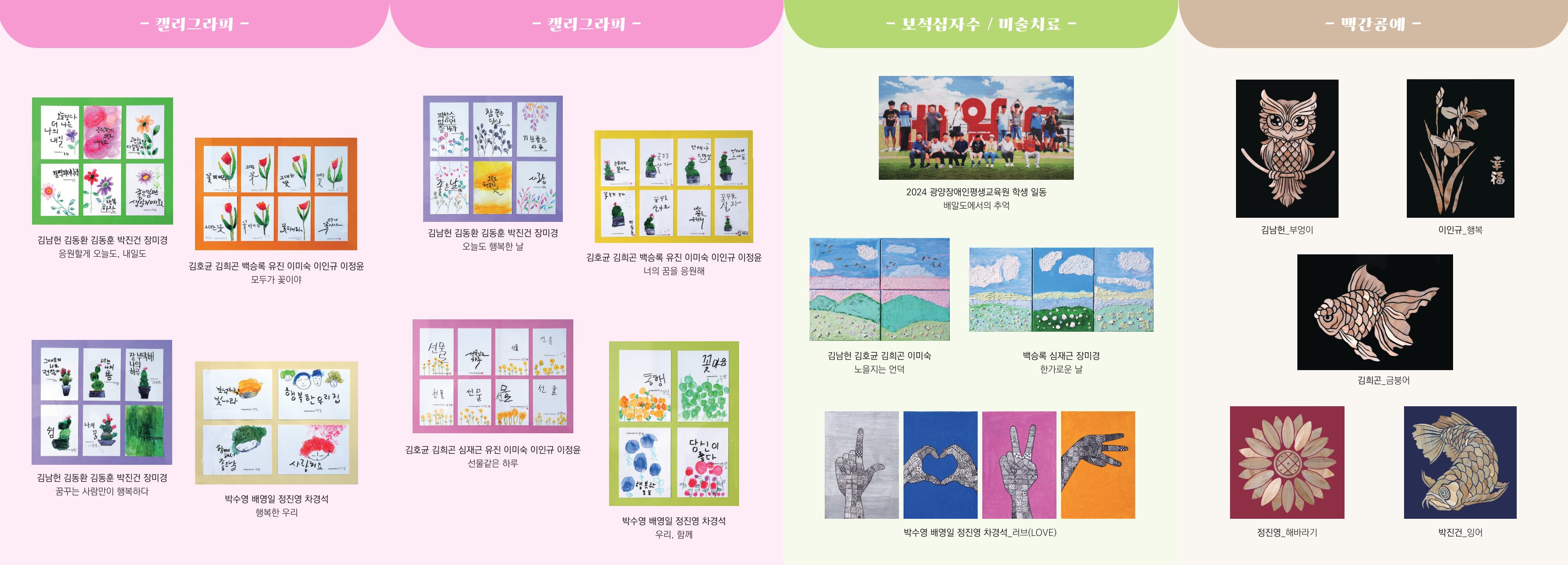 광양장애인평생교육원(원장 배수미)은 11월 18일부터 29일까지 전라남도 동부청사 갤러리에서 학습자 17명의 1년 동안 평생교육을 통해 제작한 성과물을 전시한다