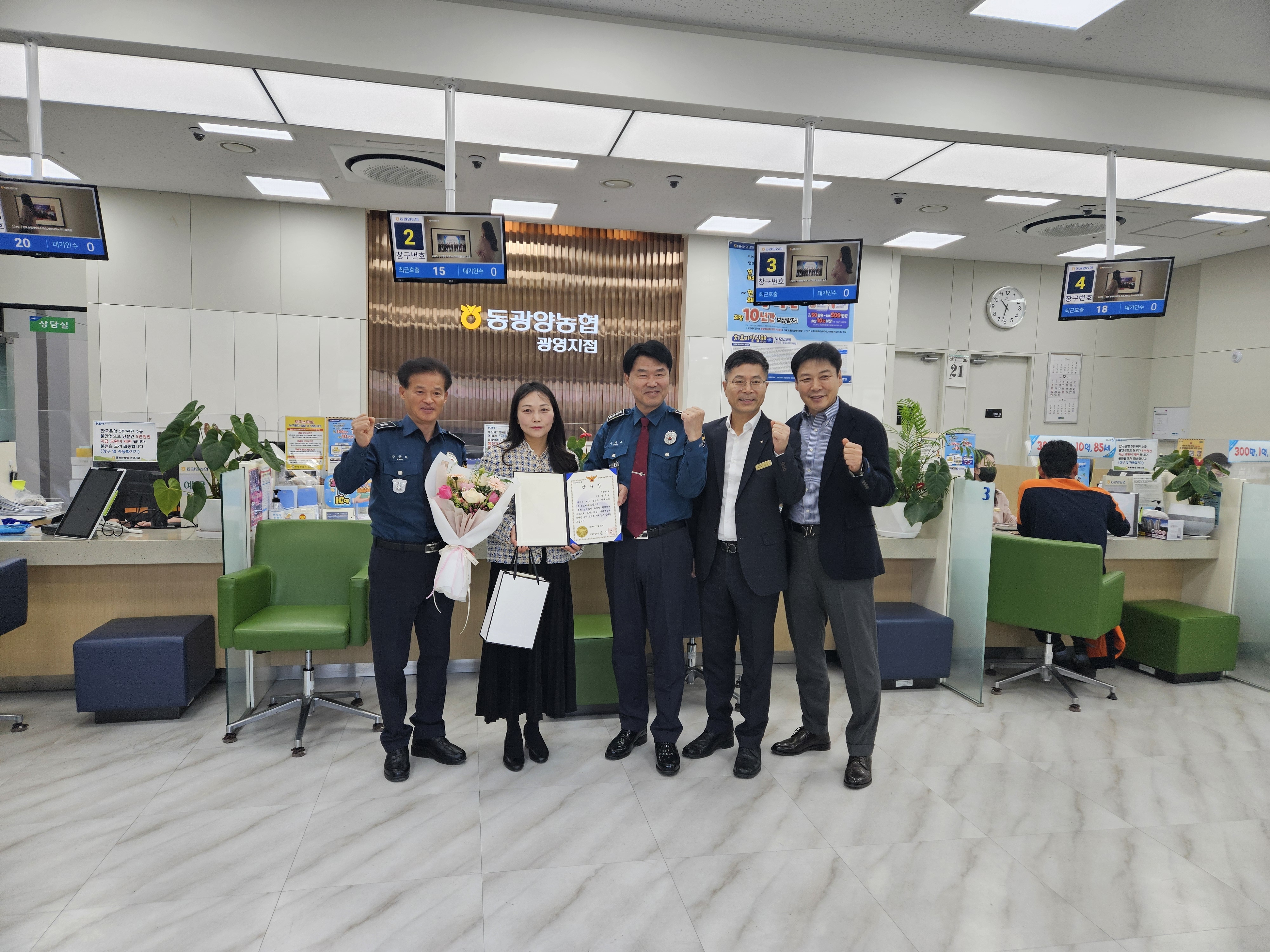 동광양농협(조합장 이돈성) 광영지점에 근무하는 직원 A씨가 전기통신금융사기(보이스피싱) 피해를 예방한 공로를 인정받아 21일 광양경찰서(서장 송기주)로부터 감사장을 받았다.