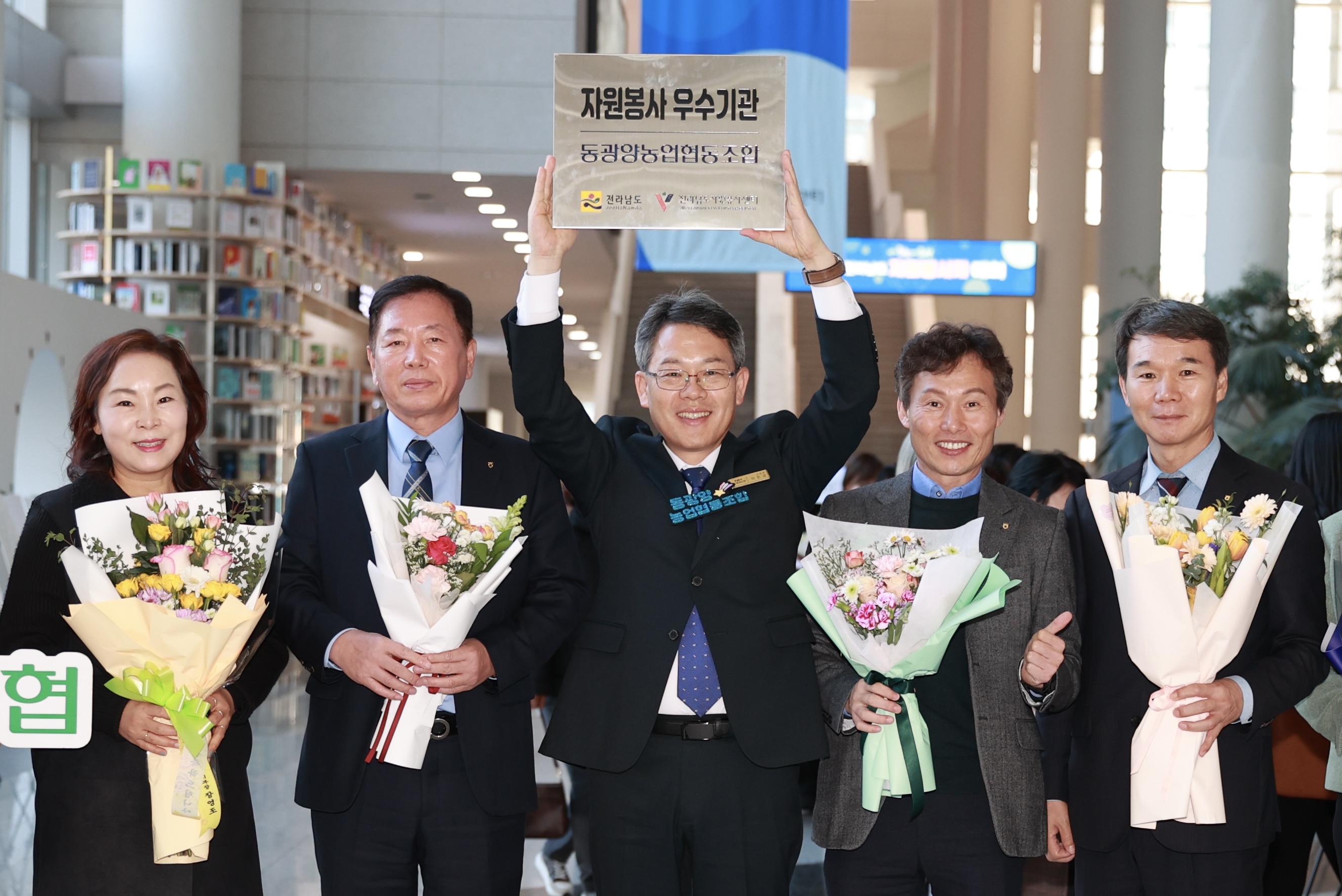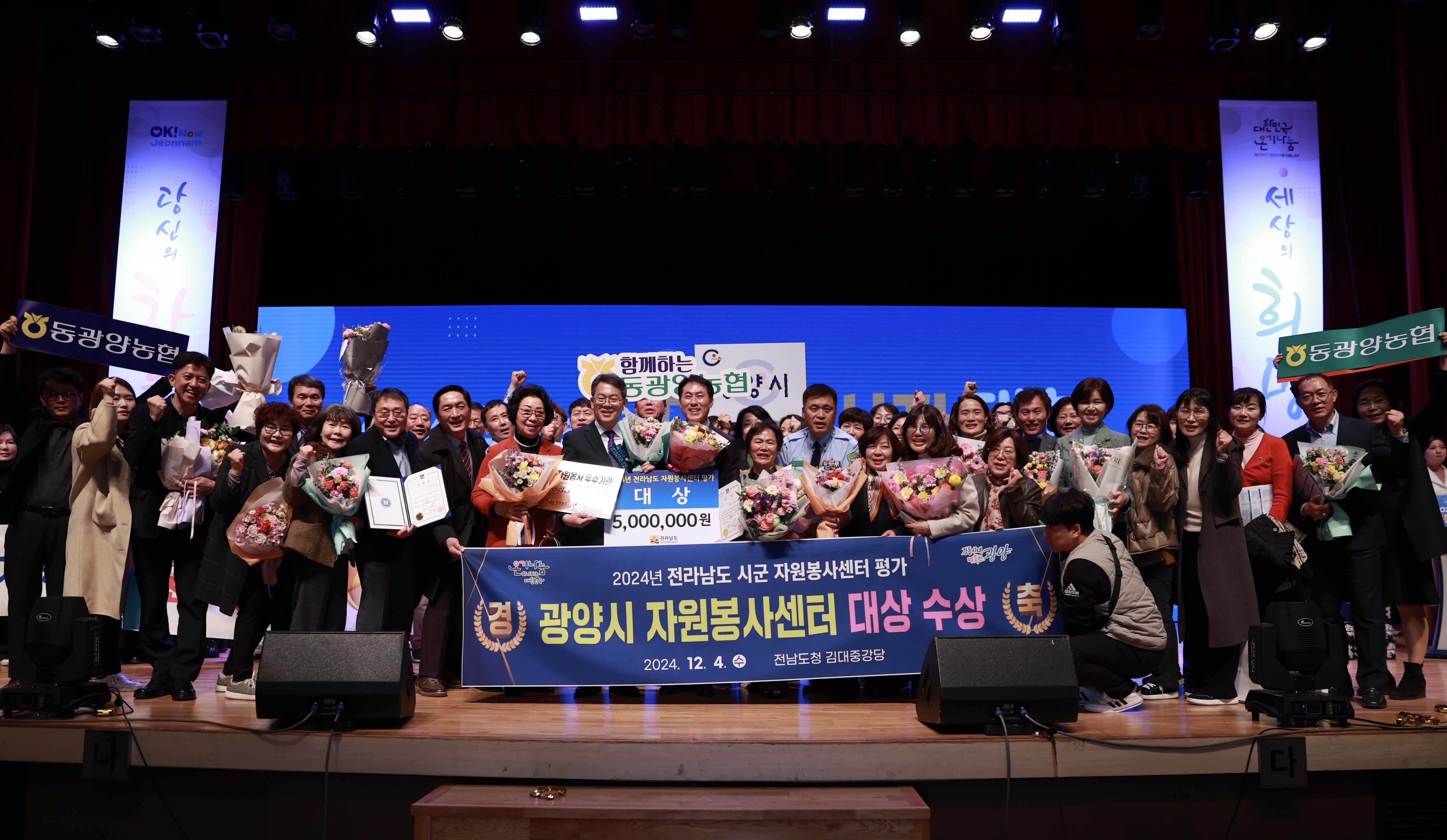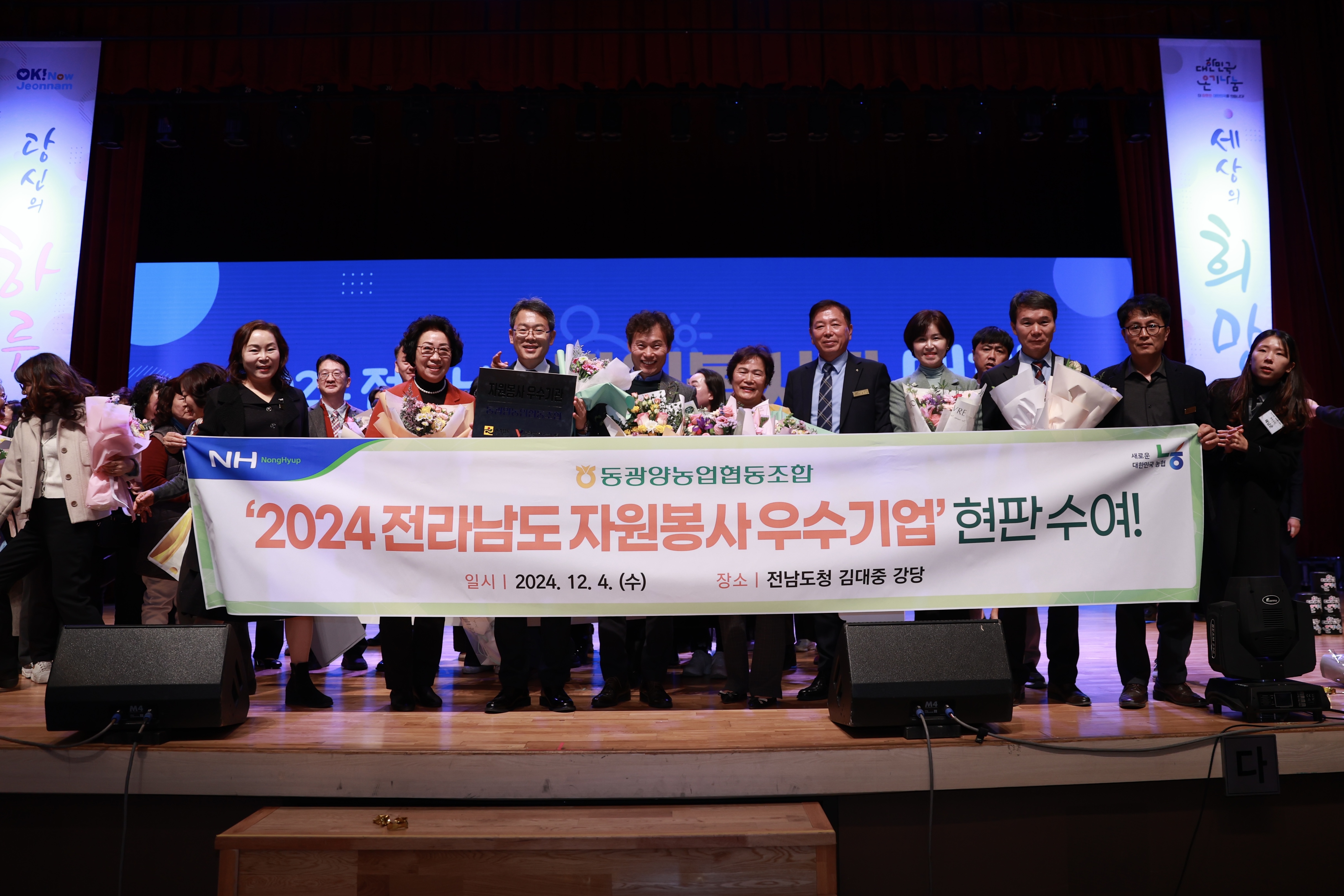 동광양농협(조합장 이돈성)이 4일 전남도청 김대중 강당에서 열린 ‘2024 전라남도 자원봉사자 대회’에서 자원봉사 우수기업에 선정되어 현판을 수여 받았다.