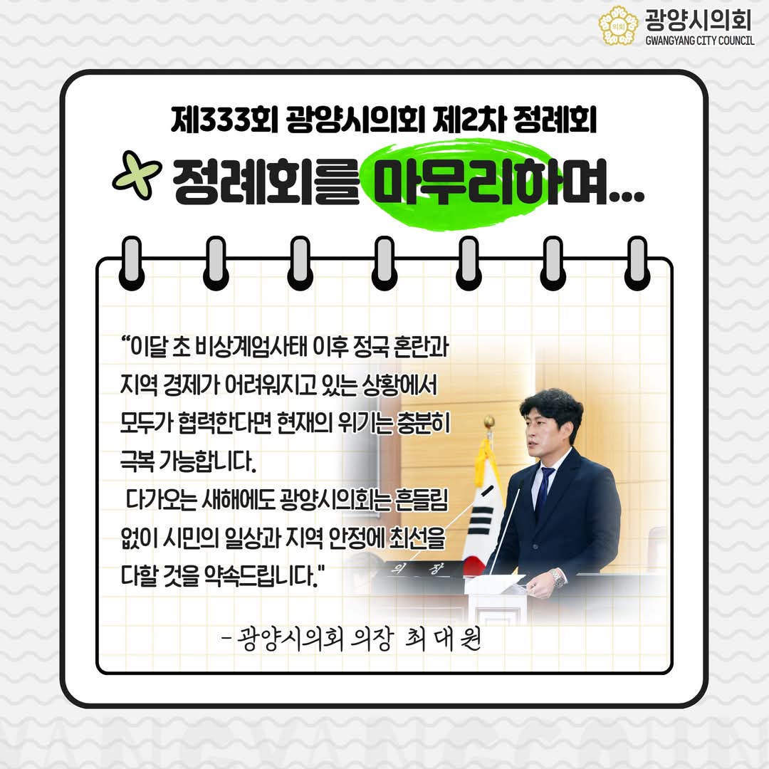 광양시의원들은 다가오는 2025년 새해에도 시민여러분과 함께하는 의회, 시민이 행복한 광양을 위해 최선을 다하겠다고 말하였다.