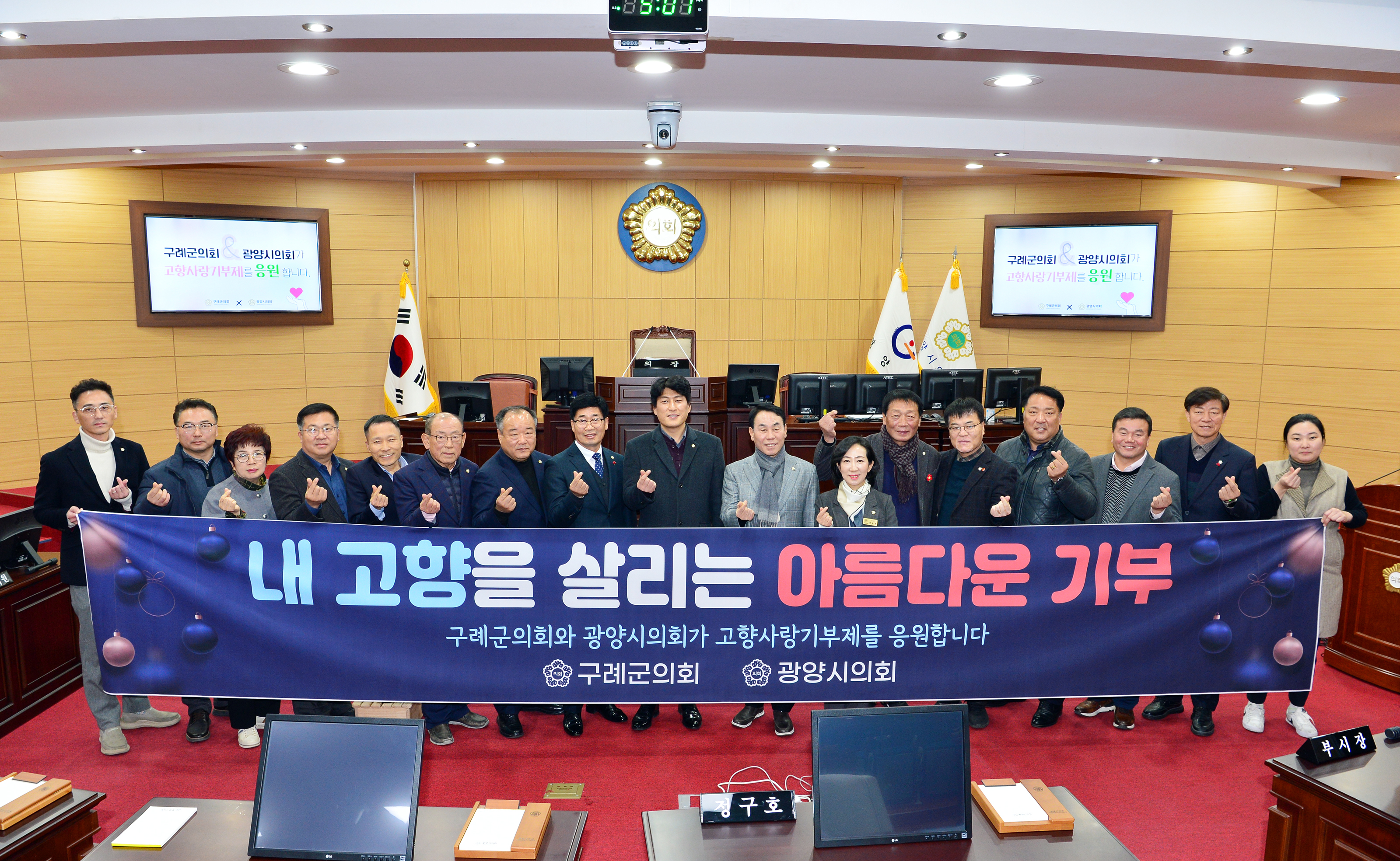 광양시의회(의장 최대원)와 구례군의회(의장 장길선)는 지난 23일 광양시의회에서 고향사랑기부금을 서로에게 기부하는 뜻깊은 행사를 가졌다.