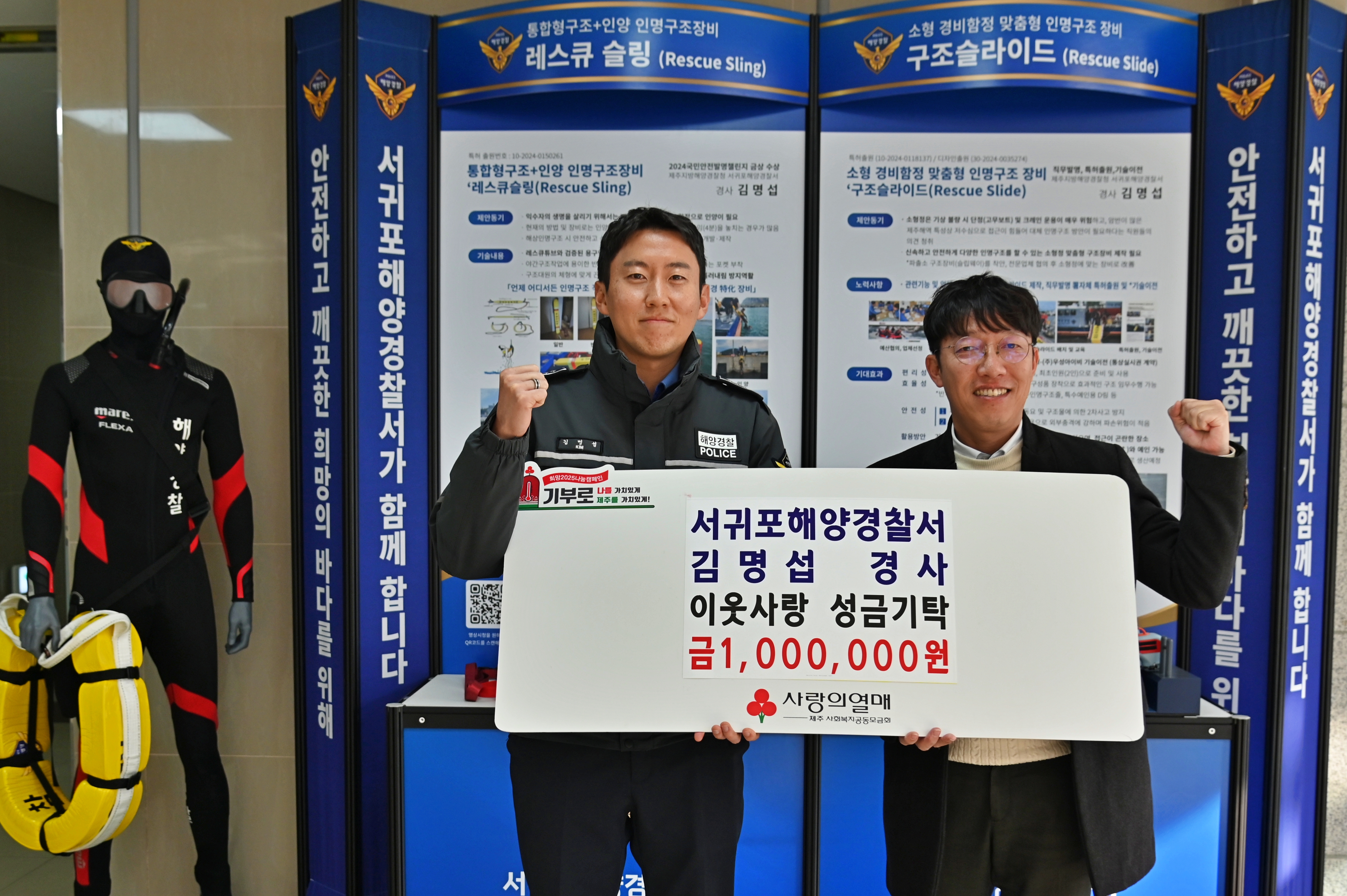 서귀포해양경찰서(서장 김서구)는「2024 국민안전 발명챌린지」에서‘금상’을 수상한 김명섭 경사가 받은 상금 전액(100만원)을「사회복지공동모금회(사랑의 열매)」통해 기부하였다고 밝혔다.