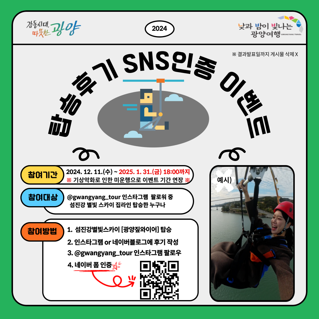 한편, 광양 짚와이어 ‘섬진강 별빛 스카이’ 개장 기념 탑승 후기 SNS 이벤트가 기상 악화에 따른 미운행 발생으로 이달 말까지 연장된다.