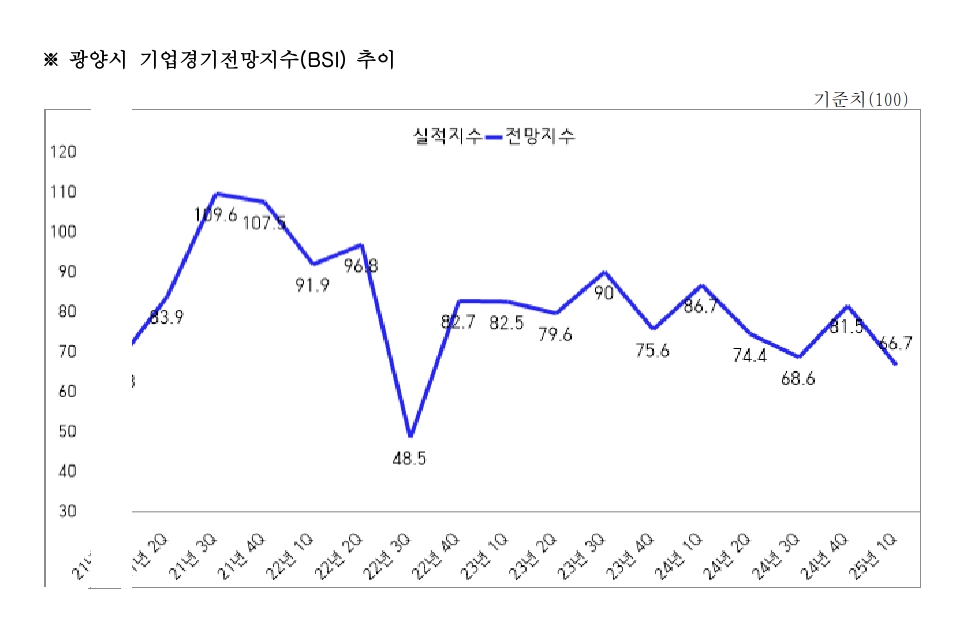광양상공회의소(회장 우광일)가 지역기업 100여 곳을 대상으로 11월 25일부터 11월 29일까지(5일간) 조사한 ‘2025년 1/4분기 기업경기전망조사' 결과, 기업경기전망지수(BSI : Business Survey Index)’가 66.7P로 집계되었다고 밝혔다.