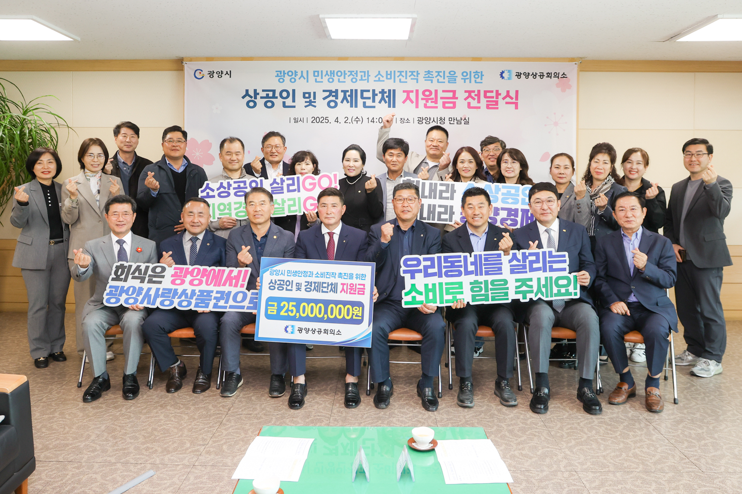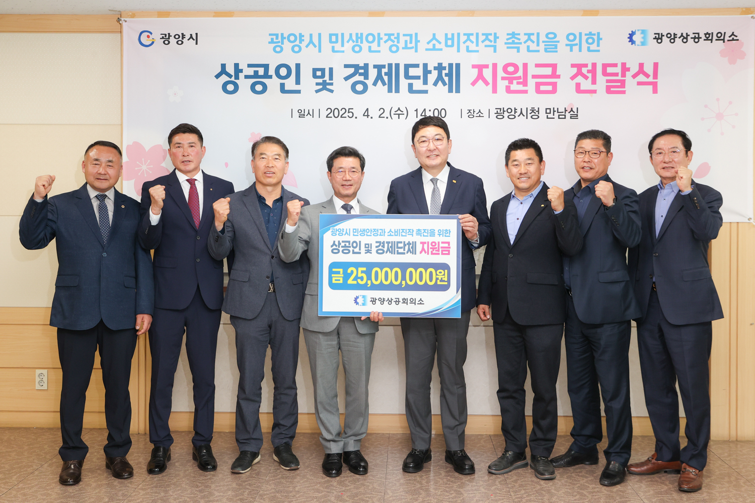 이날 전달식에는 정인화 광양시장과 관내 상공인 및 경제단체 회장단 등 20여명이 참석한 가운데 단체별 지원금 전달과 소비진작 촉진을 위한 퍼포먼스가 진행되었다.