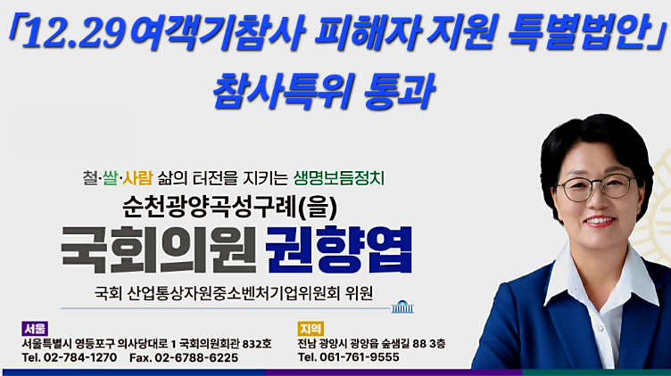 권향엽 국회의원(전남 순천광양곡성구례을, 더불어민주당)이 대표 발의한 「12·29여객기참사 피해구제 및 지원 등을 위한 특별법안」(이하 특별법안)이 7일 ‘국회 12.29 여객기 참사 진상규명과 피해자 및 유가족의 피해구제를 위한 특별위원회(이하 참사특위)’ 전체회의를 통과했다.
