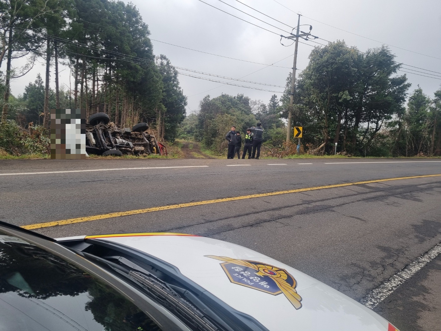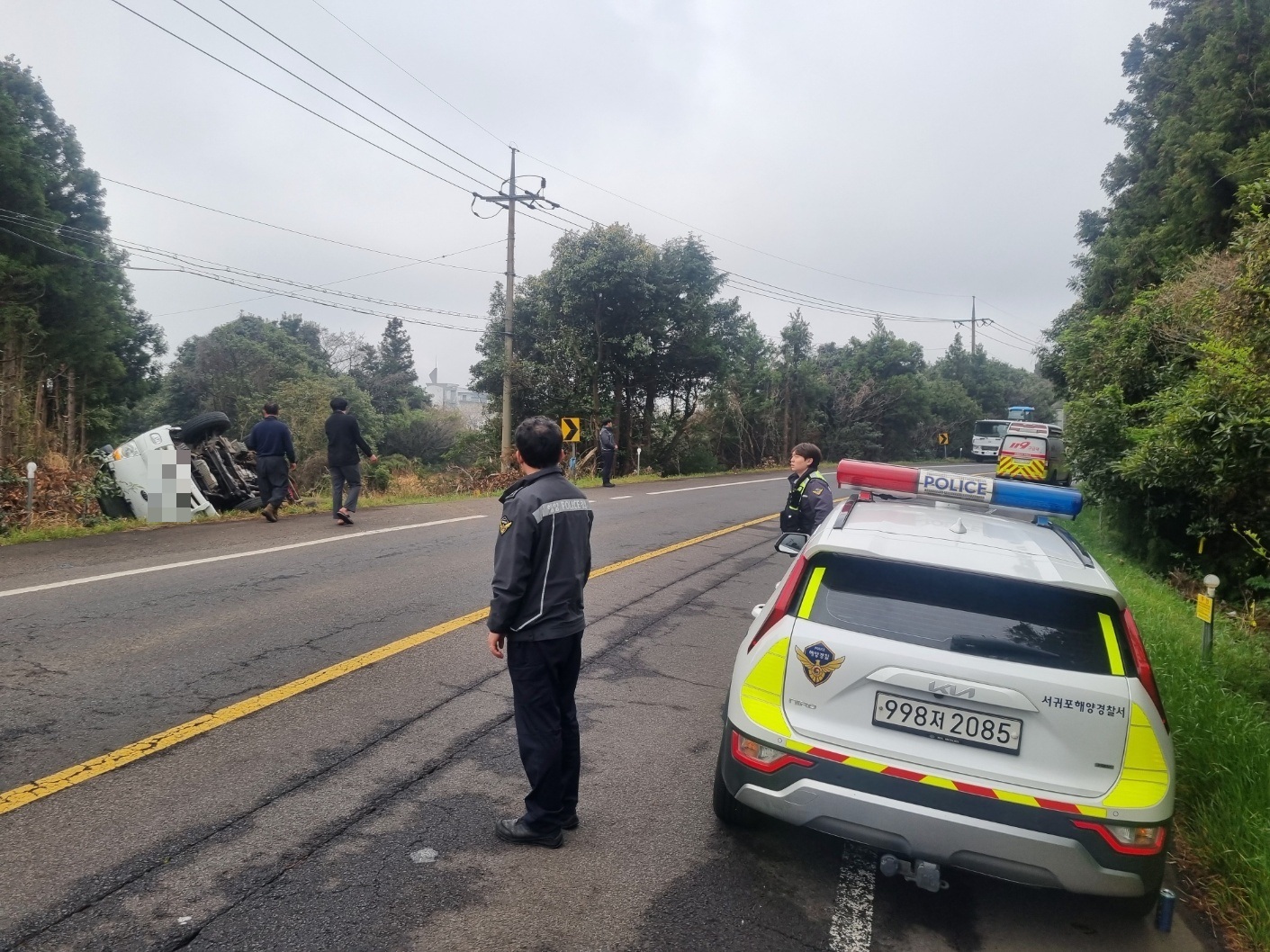 서귀포파출소 순찰팀은 어제(10일) 순찰 중 오전 9시 5분 제주 표선면 성읍리 인근 도로에서 발생한 차량 전복 사고를 발견하고 신속히 대응했다. 사고 현장은 2차사고 위험이 높은 도로변으로 주변 차량을 통제하고 구조 작업을 진행해 운전자를 차량에서 안전하게 구조했고, 운전자는 생명에 지장이 없는 상태로 출동한 119 구조대에 인계되었다.