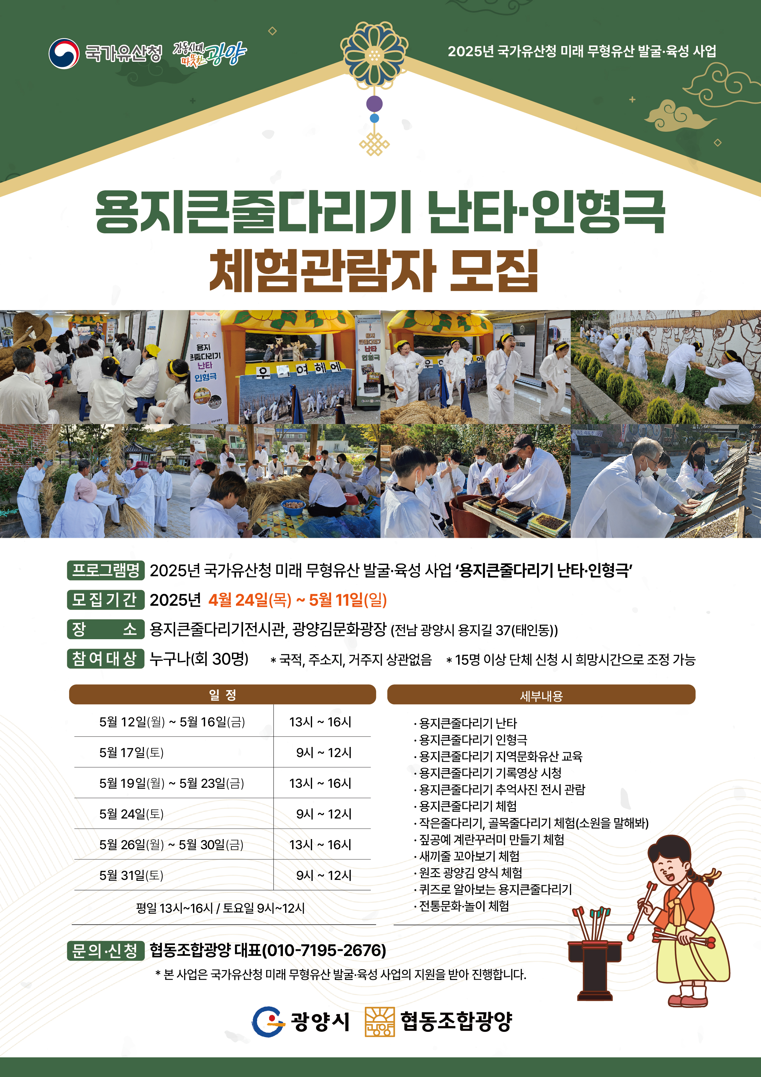협동조합광양은 오는 11일까지 2025년 국가유산청 미래 무형유산 발굴·육성 사업 ‘김 풍작 소원 비세_용지큰줄다리기’의 첫 번째 프로그램인 ‘용지큰줄다리기 난타·인형극’ 5월 체험관람자를 추가 모집한다.