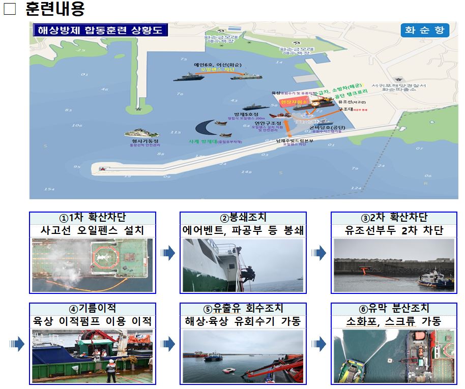 이날 훈련은 화순항으로 입항 중인 유조선이 방파제와 충돌하며 기름이 해상에 유출되는 상황을 가정하여, 훈련세력은 긴급 방제조치 및 확산 방지를 위한 파공부위 긴급봉쇄, 오일펜스 설치, 기름회수 훈련 등을 실전처럼 진행했다.
