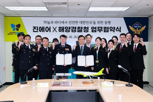 해양경찰청(청장 김용진)과 진에어(대표이사 박병률)는 바다에서 하늘까지 안전한 대한민국을 만들기 위한 업무협...