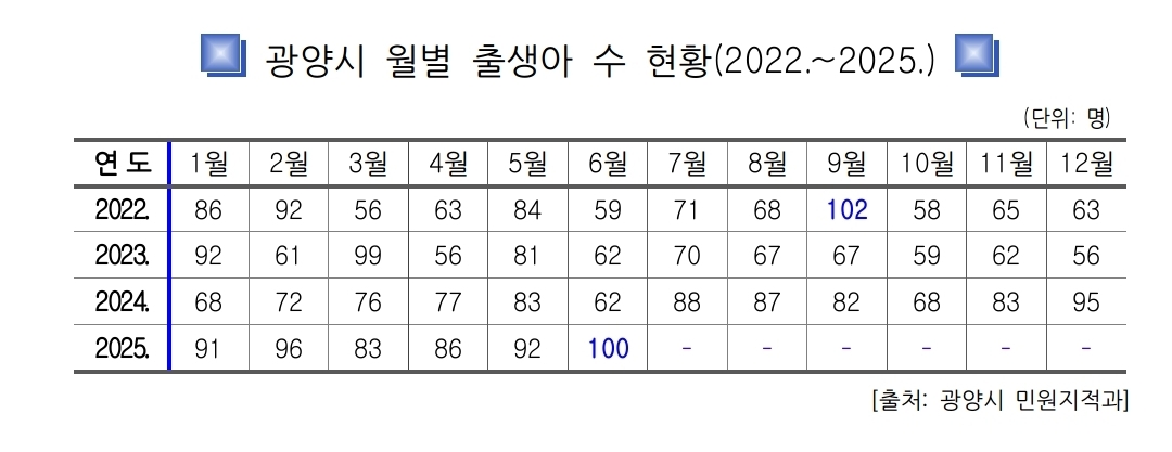황영숙 광양시 출생보건과장은 “출생률 감소와 지역 소멸에 대한 우려가 컸던 상황에서 6월 출생아 수가 100명을 넘어선 것은 ‘세 자릿수 돌파’라는 상징적 의미를 지닌다”며 “지역사회와 광양시의 인구정책 모두에 자신감을 불어넣는 기준선이 됐다”고 말했다.