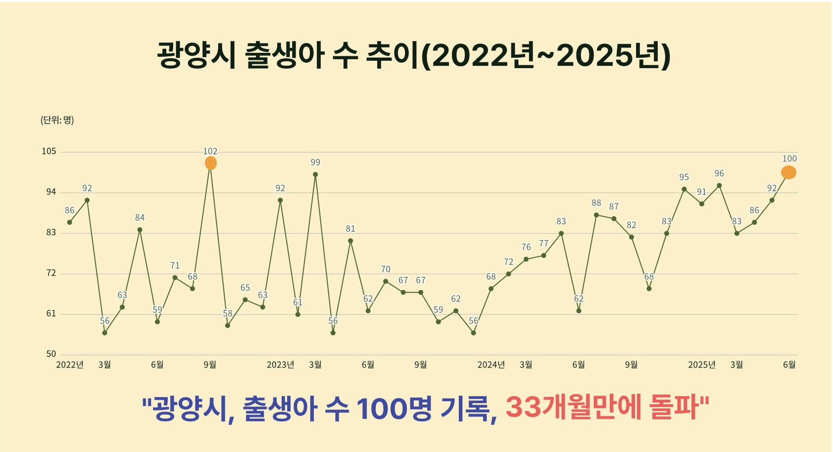 2025년 6월, 전남 광양시(시장 정인화)의 출생아 수가 33개월 만에 다시 세 자릿수 벽을 넘어섰다. 2022년 9월 이후 처음으로 월간 출생아 수가 100명을 넘어서며, 저출산 위기 속에서 이례적인 반등 사례로 주목받고 있다.