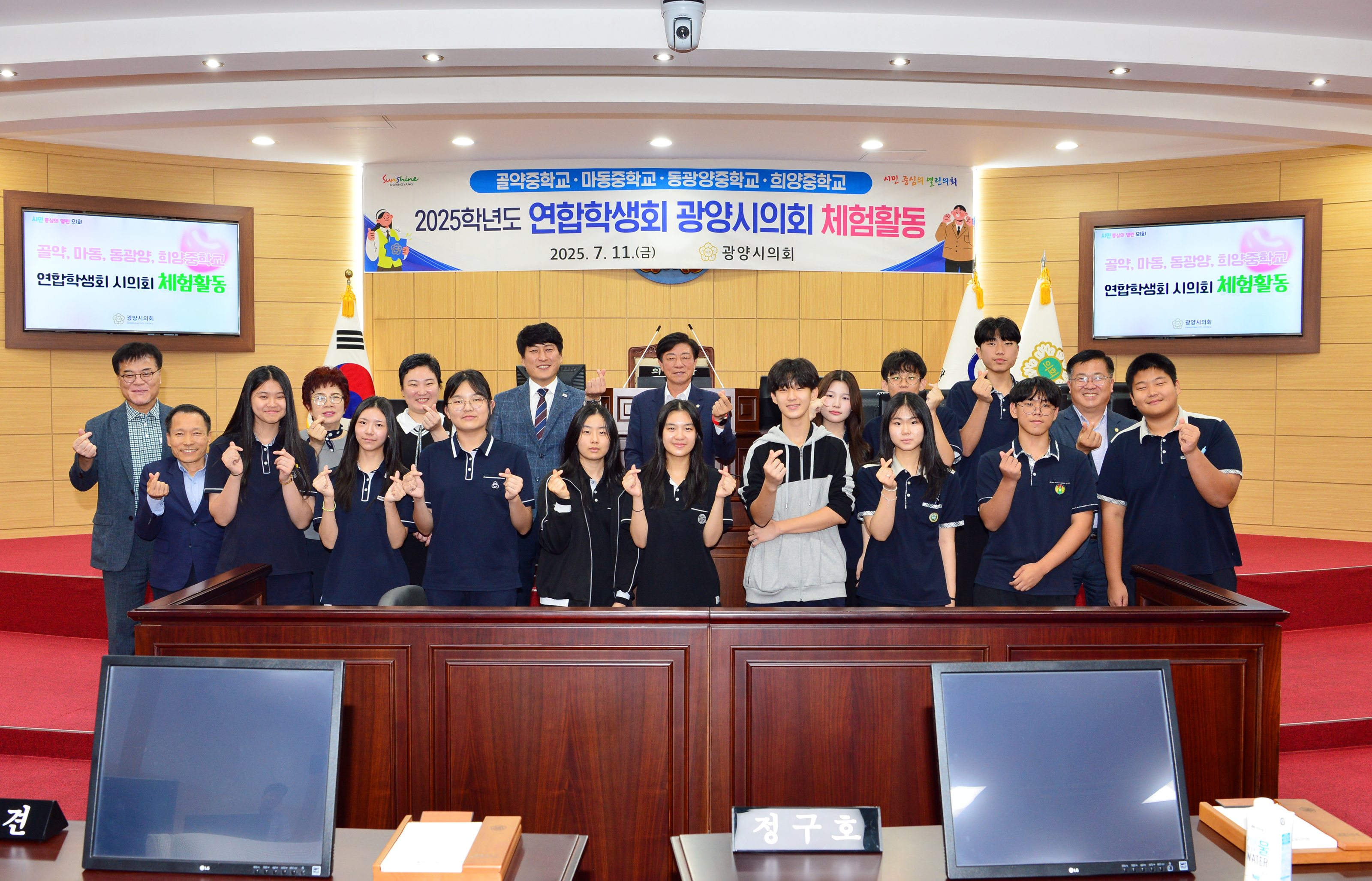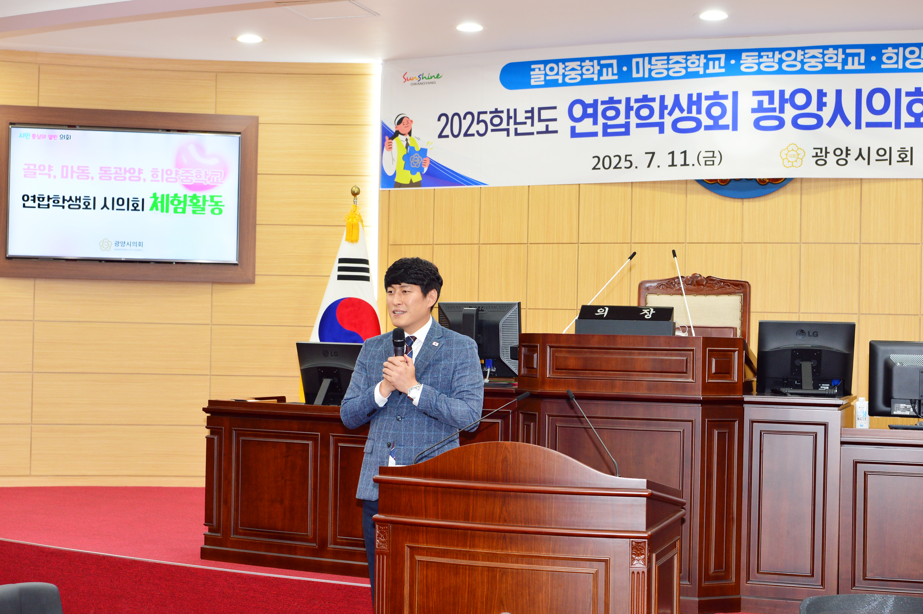 광양시의회(의장 최대원)는 지난 11일 본회의장에서 관내 4개 중학교(골약중, 마동중, 동광양중, 희망중)의 연합학생회 소속 학생을 대상으로 ‘시의회 체험활동’을 진행했다고 밝혔다.