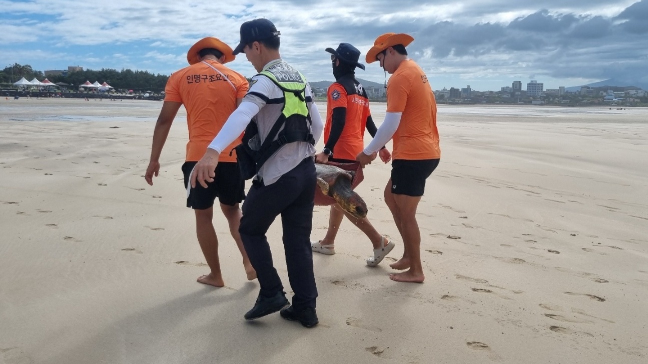 서귀포해경에 따르면, 표선해수욕장 상황실 약 200m 앞 해상에서 등껍질이 다친 거북이를 발견했다는 신고가 접수되어, 곧바로 현장에 출동한 구조세력은 해수욕장 안전요원과 함께 거북이를 해안가로 이동시켰으며, 아쿠아플라넷 구조팀이 도착하기 전까지 산소 공급 및 수온 유지 등 응급 조치를 실시하였다.