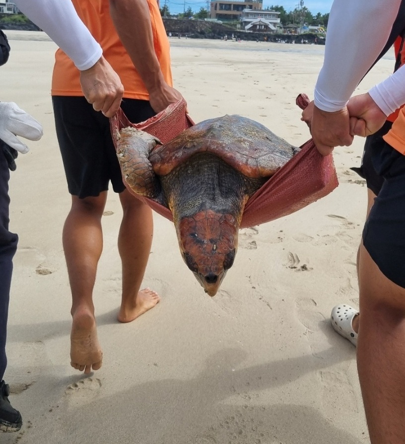 서귀포해양경찰서(서장 김서구)는 어제(27일) 오후 3시20분경 서귀포시 표선해수욕장 앞 해상에서 멸종위기종인 붉은바다거북 한 마리를 발견했다는 신고를 받고 안전하게 구조했다고 밝혔다.