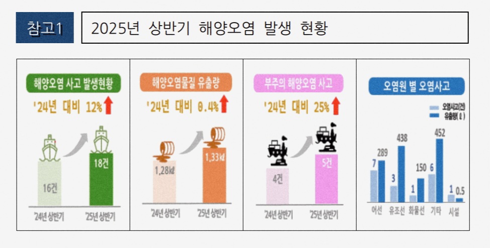여수해양경찰서(서장 김기용)는 2025년 상반기 전남 동부 해역에서 총 18건의 해양오염 사고가 발생해, 약 1.33kℓ의 오염물질이 해상에 유출된 것으로 분석됐다고 밝혔다.