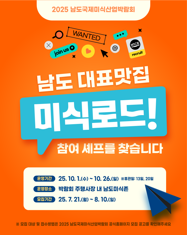 모집 대상은 전라남도에 6개월 이상 거주하거나 사업장을 두고 있는 셰프 또는 맛집 운영자다. 2인 이상의 팀으로 참여할 수 있으며, 하루 500인분 이상의 조리가 가능하고, 미식로드 운영과 조리에 직접 참여해야 한다. 참가팀은 전 기간(10월 1일~26일) 또는 기간별 구간을 선택해 참여할 수 있으며, 전체 기간 참여자가 우선 선정된다.