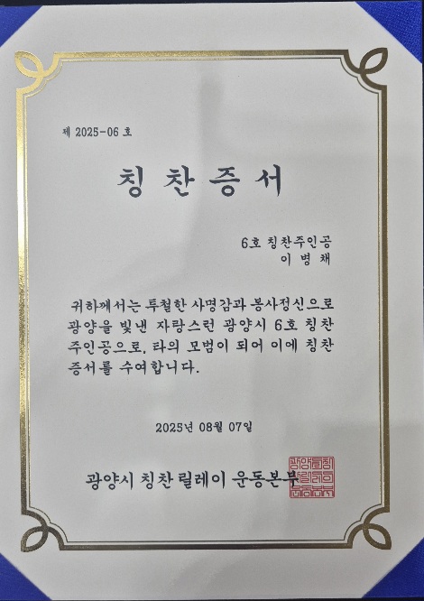광양참여연대가 지역사회 칭찬문화 확산을위한 '칭찬합시다. 100인 칭찬릴레이 운동'을 추진선정 이번 8월 6일 6호 칭찬주인공으로 이병채씨가 선정되었다.