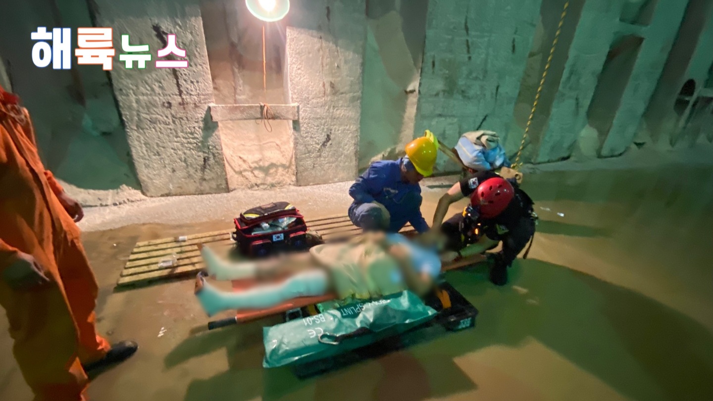 화물선이 묘박지 투묘 완료 후 해양경찰구조대 대원들이 환자 구조 및 이송을 위해 화물선에 탑승하였고 응급구조사가 로프를 이용하여 약 15m 높이 화물창 밑으로 내려가 응급환자 상태 확인 및 경추 손상 방지를 위한 응급조치를 실시하였다.