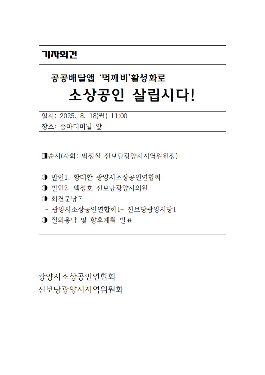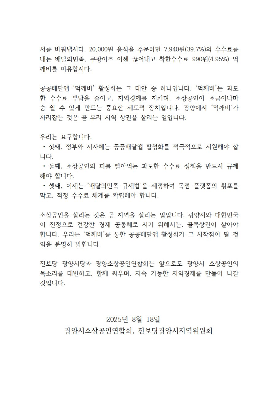 광양시소상공인연합회와 진보당 광양시위원회는 지난 18일 중마터미널 앞에서 기자회견을 열고 민간 배달앱의 과도한 수수료 문제를 지적하며 공공배달앱 '먹까비' 활성화를 통한 소상공인 보호를 강력히 측구했다.