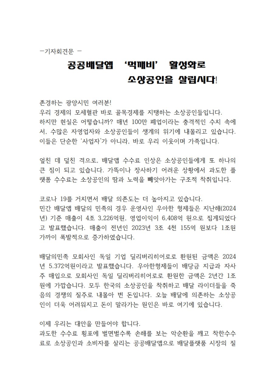 이번 기자회견은 코로나19와 고금리고물가 등으로 생존 위기에 내몰린 소상공인들이 민간 배달앱의 과도한 수수료 부담에 고통받고 있는 현실을 알리고, 착한 수수료의 공공 배달앱 먹깨비를 활성화해 지역 소상공인과 상권을 살리기 위한 대안을 촉구하기 위해 마련됐다.