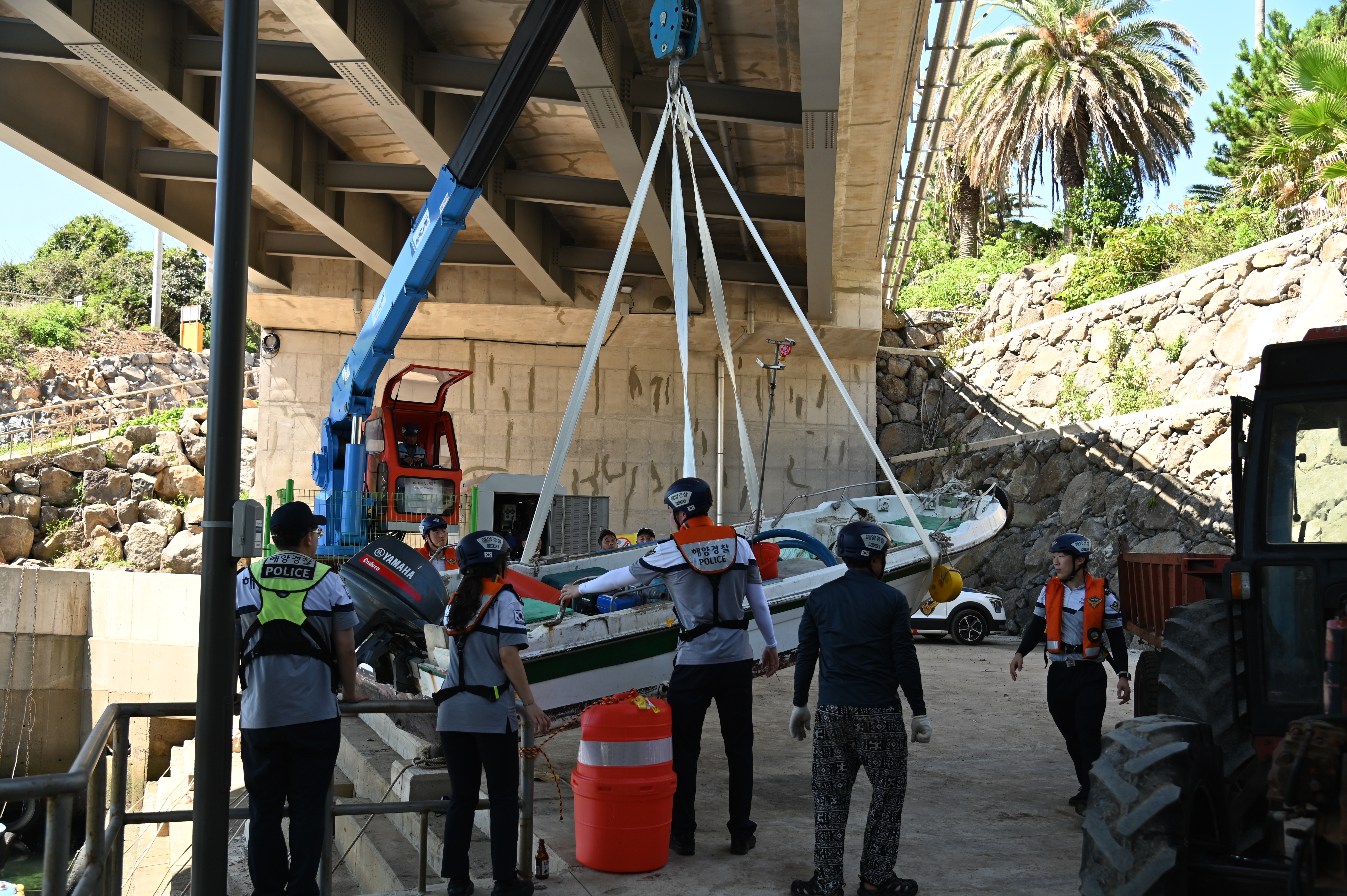 훈련은 서귀포파출소와 월평어촌계, 해양재난구조대, 선박소유자 등이 합동으로 참석한 가운데 태풍으로 인한 너울로 월평포구 내 정박한 선박이 충돌·침수되는 사항을 가정해 긴급구조 요청부터 배수작업, 고정크레인 이용 육상 인양 등 해양 사고 시 초동·사후조치 및 유관기관·민간과의 협업 등 전 과정을 점검했다.
