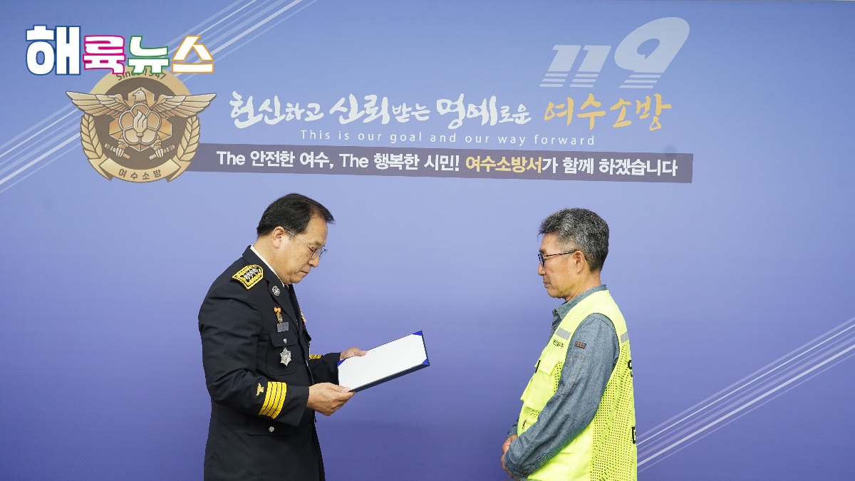 여수소방서(서장 서승호)는 8월 25일 화재진압 유공 민간인 표창장 수여식을 개최하고 골목길 소화기함을 이용해 신속한 초기 대응으로 화재 피해를 최소화한 민간인에게 표창을 수여했다.