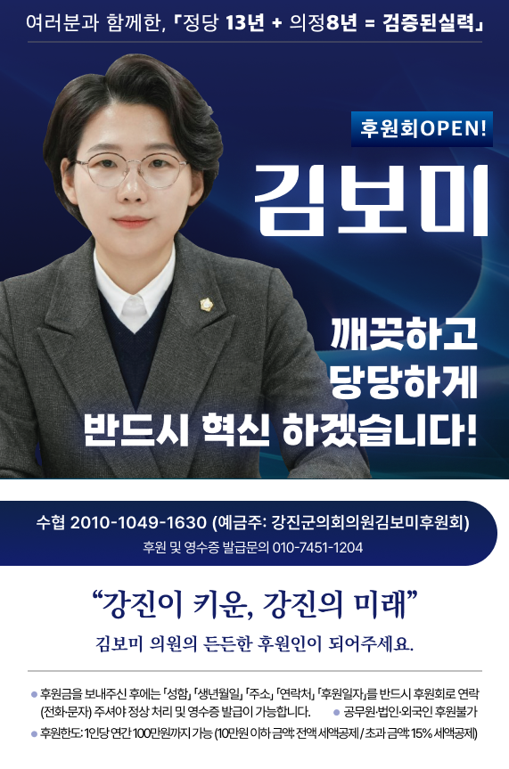 한편, 후원은 수협은행 2010-1049-1630 계좌(예금주: 강진군의회의원 김보미 후원회)를 통해 가능하다. 후원금은 1인당 연간 100만 원까지 가능하며, 공무원·법인·외국인은 후원할 수 없다. 10만 원 이하 후원금은 전액 세액공제, 초과 금액은 15% 세액공제가 적용된다. 후원금을 송금한 뒤에는 성함, 생년월일, 주소, 연락처, 후원일자를 전화·문자·메일로 알려야 정상 접수와 영수증 발급이 가능하다.