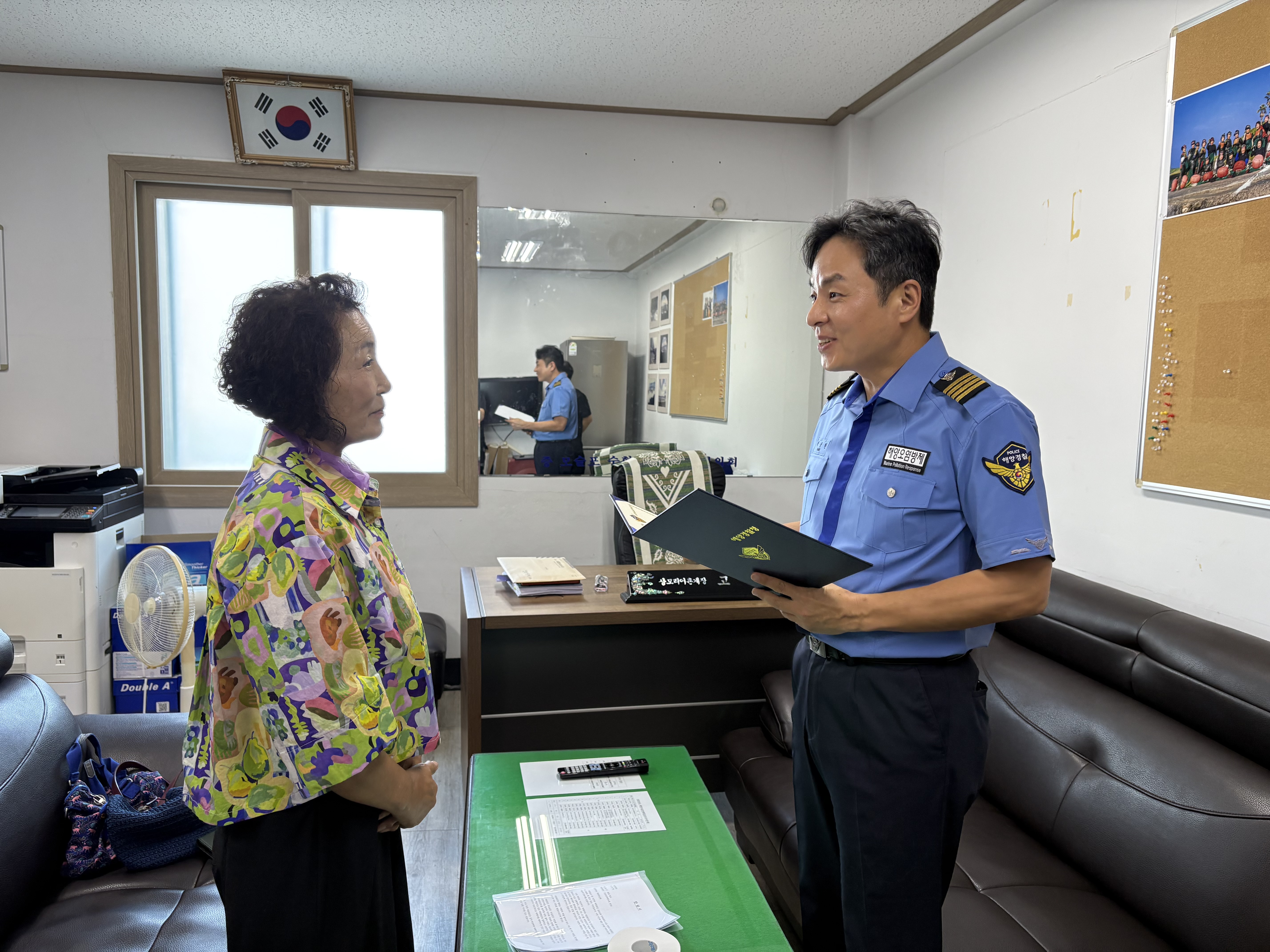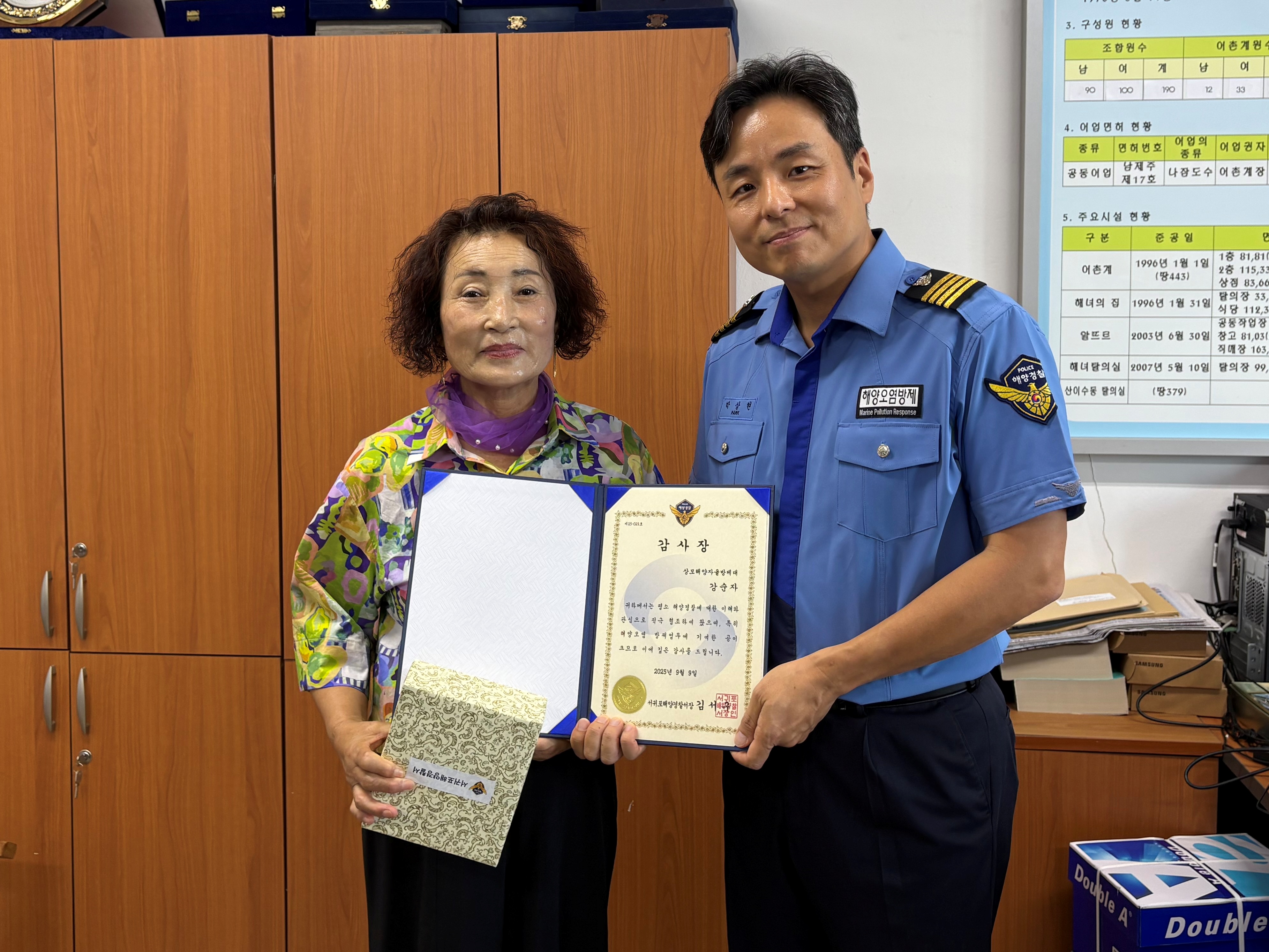 서귀포해양경찰서(서장 김서구)는 지난 7월 24일 송악산 인근 해상에서 발생한 어선 A호 좌초 사고 당시 방제조치에 적극 참여한 상모해양자율방제대* 강순자 대원의 공로를 인정해 오늘(11일) 감사장을 수여했다고 밝혔다.