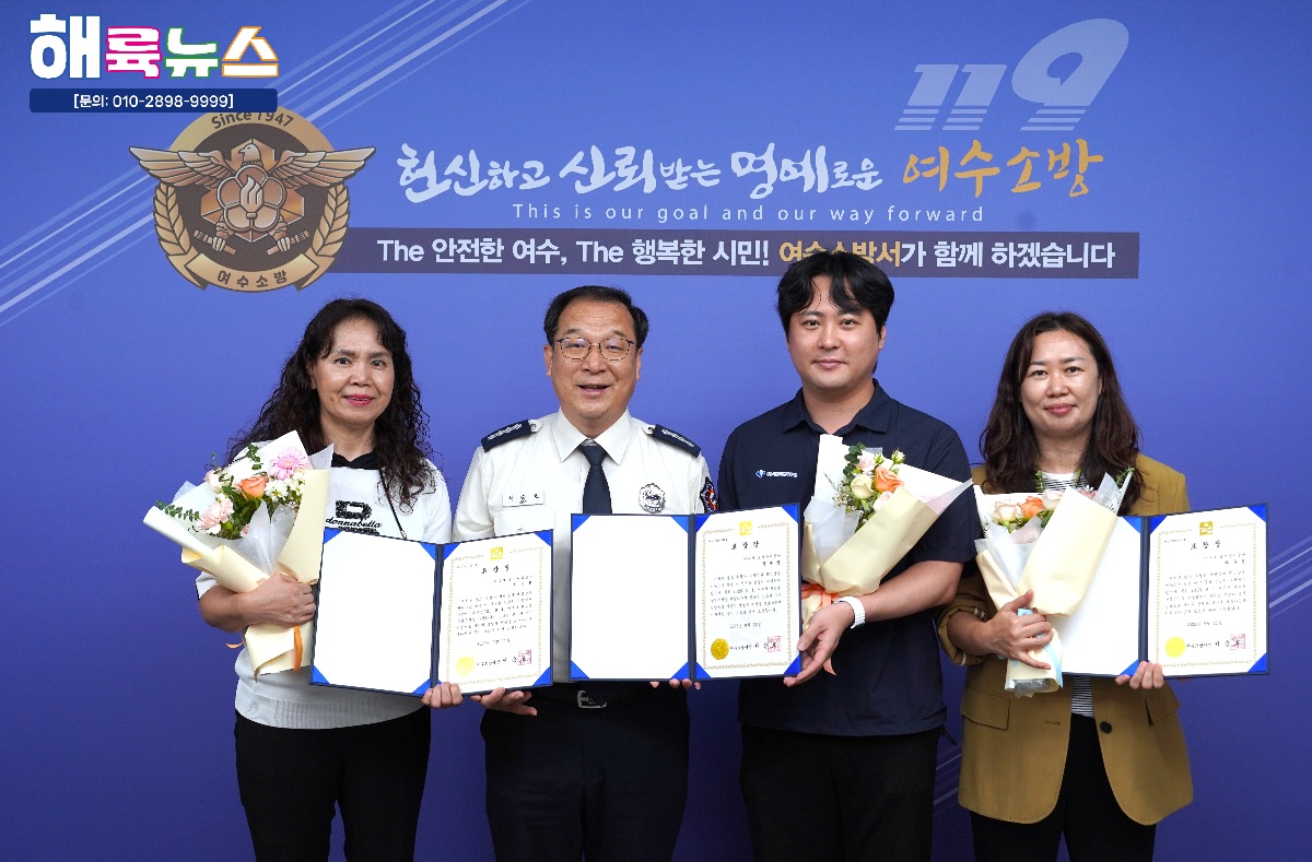 여수소방서(서장 서승호)는 2025년 9월 11일, 최근 발생한 차량화재 현장에서 초기대응에 크게 기여한 여수시 도시관리공단 직원 정○○ 등 3명에게 화재 초기진압 유공 표창을 수여했다.