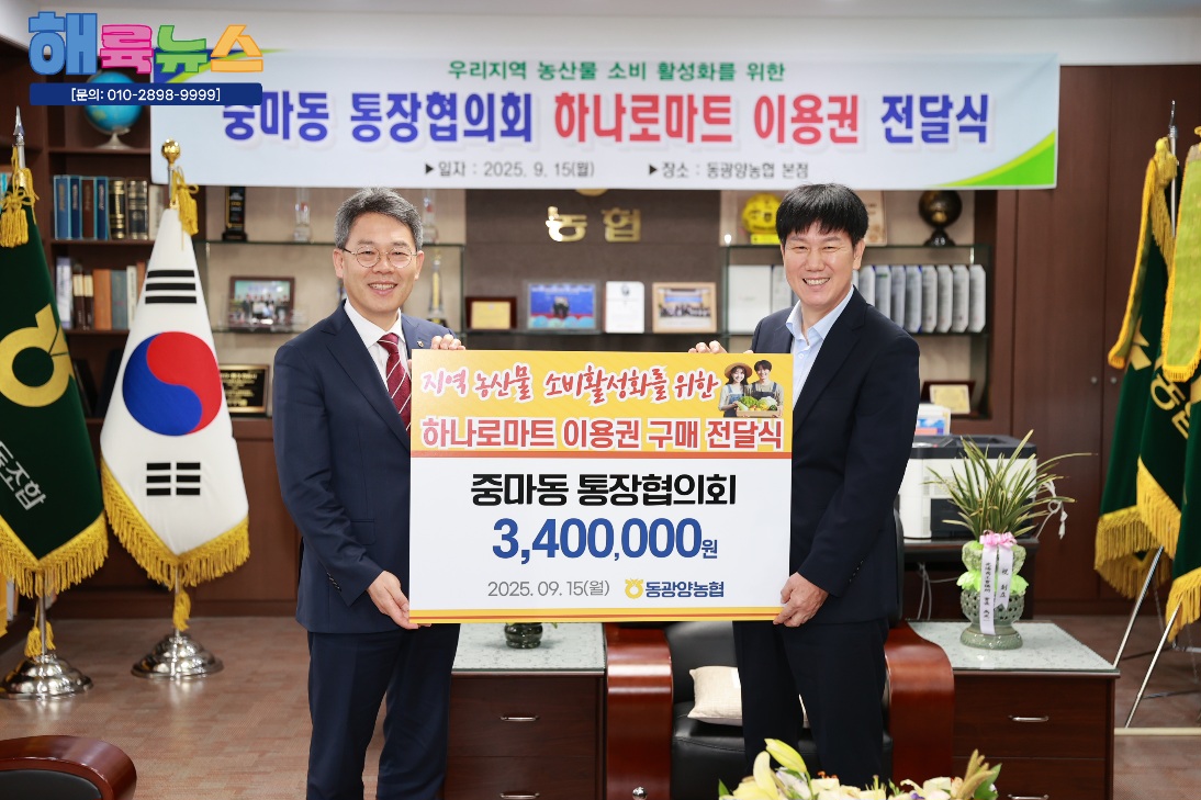 동광양농협(조합장 이돈성)과 광양시 중마동통장협의회(회장 서정환)가 지난해에 이어 올해도 지역 농축수산물 소비활성화를 위해 뜻을 모았다.