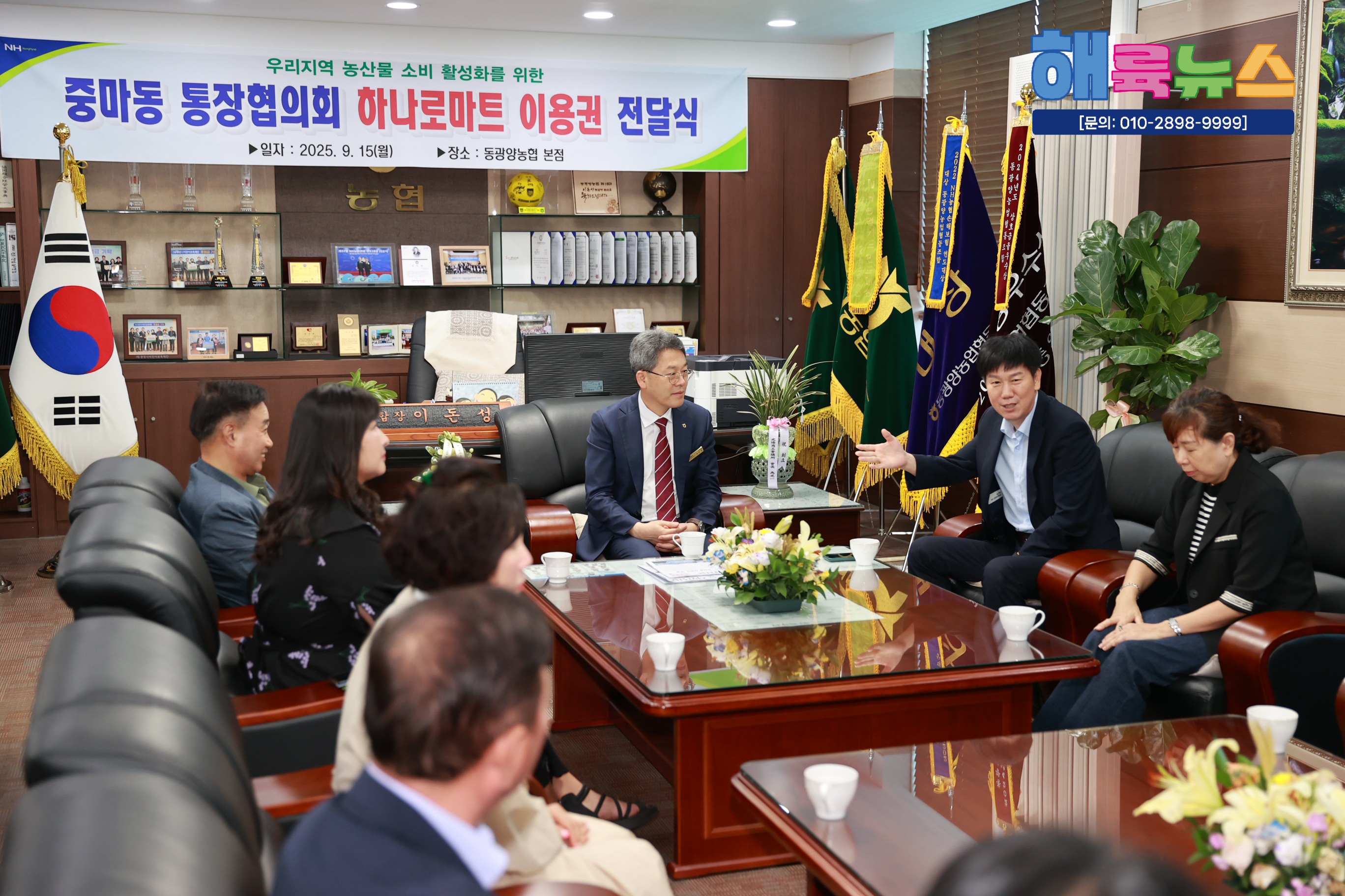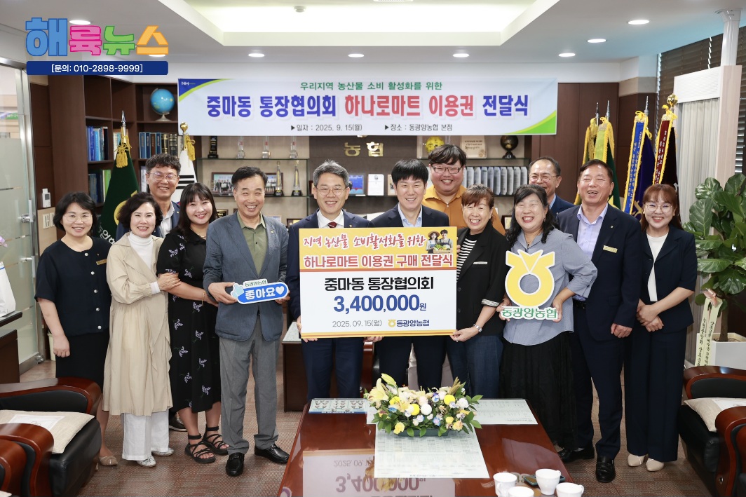 이에 공감한 중마동통장협의회는 지난해에 이어 올해도 지역 농가 지원에 힘을 보태기 위해 동광양농협 하나로마트 이용권 340만 원어치를 구입했으며, 동광양농협은 15일 감사의 마음을 담아 전달식을 가졌다.