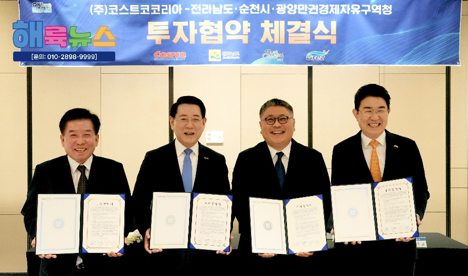 광양만권경제자유구역청(청장 구충곤, 이하 광양경자청)은 9월 30일 서울 여의도 페어몬트 앰배서더 호텔에서 글로벌 유통기업 코스트코와 투자협약(MOU)을 체결했다고 밝혔다. 협약식에는 전라남도 도지사와 순천시장이 함께 참석해 지역경제 활성화와 생활 인프라 확충을 위한 공동 의지를 다졌다.