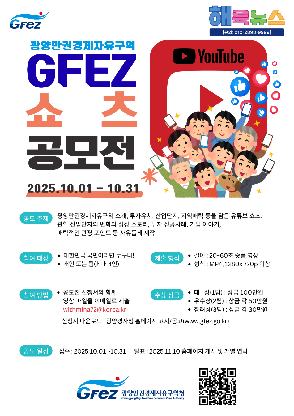 광양만권경제자유구역청(청장 구충곤, 이하 광양경자청)은 10월 1일부터 31일까지 국민 참여형 ‘2025 GFEZ 유튜브 쇼츠 공모전’을 개최한다고 밝혔다.