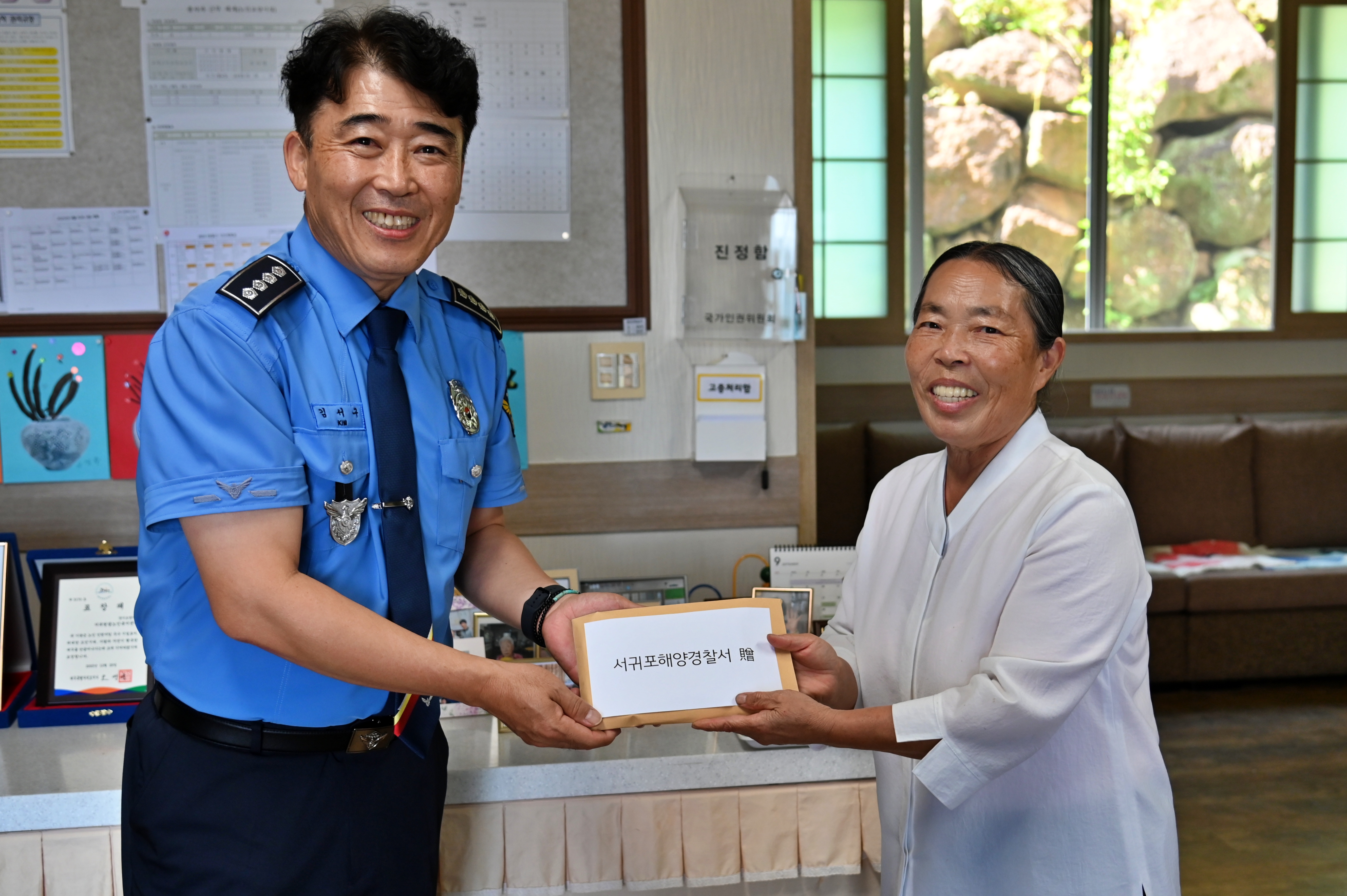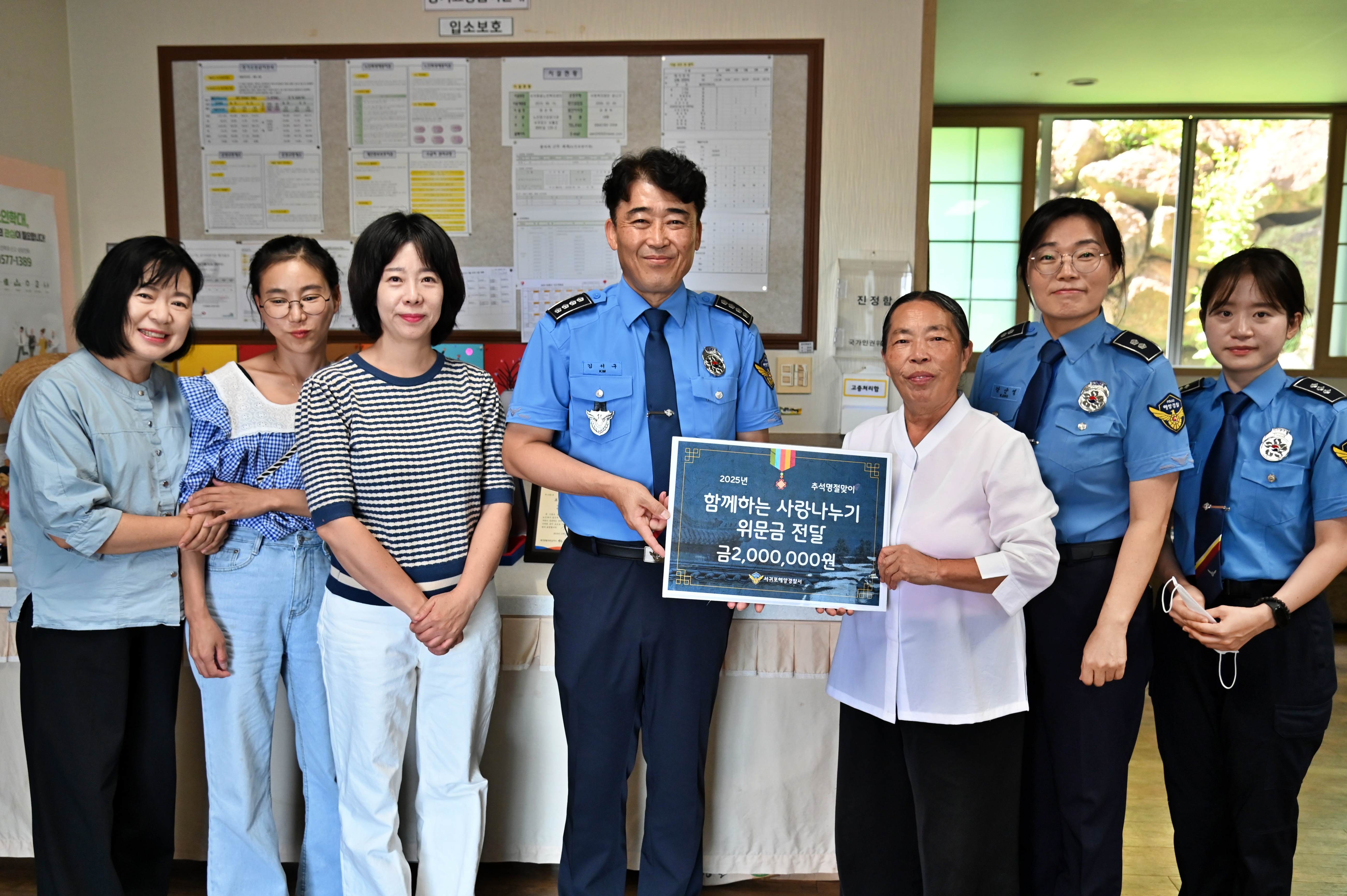 서귀포해양경찰서(서장 김서구)는 오늘(1일) 2025년 추석 명절을 맞아 지역 내 노인복지시설을 방문해 따뜻한 마음을 담은 성금 200만원을 전달했다고 밝혔다.